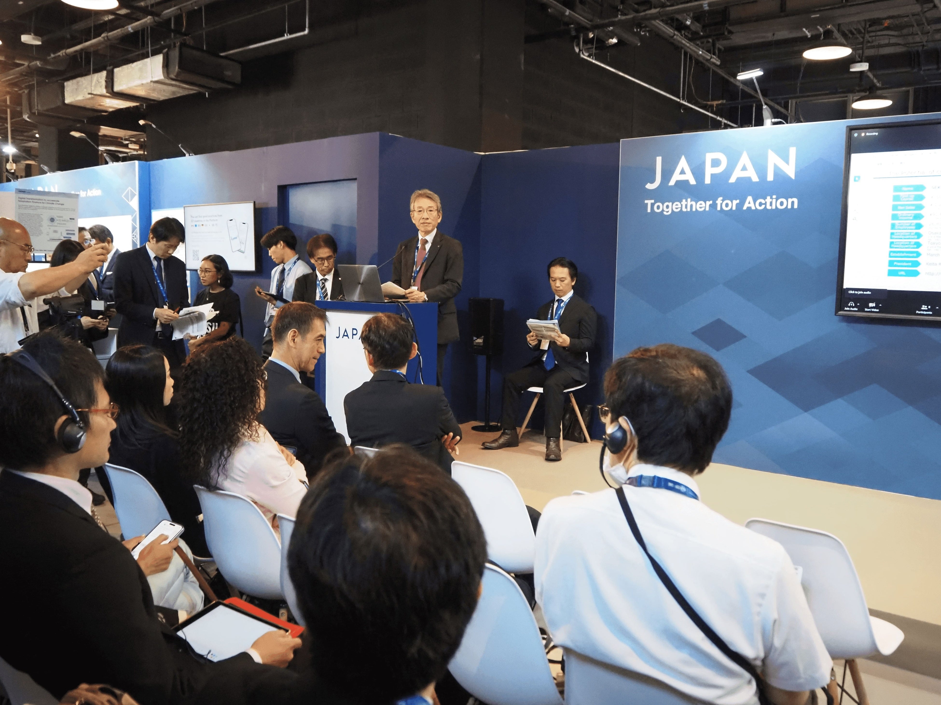 日本企業の取り組みの紹介において、当社のフィルム型ペロブスカイト太陽電池の優位性と、技術開発の現状を説明、さらに現状最大サイズの製品(90×195cm)を展示し、参加国に対して事業化に向けた取り組みの大きなアピールとなりました。