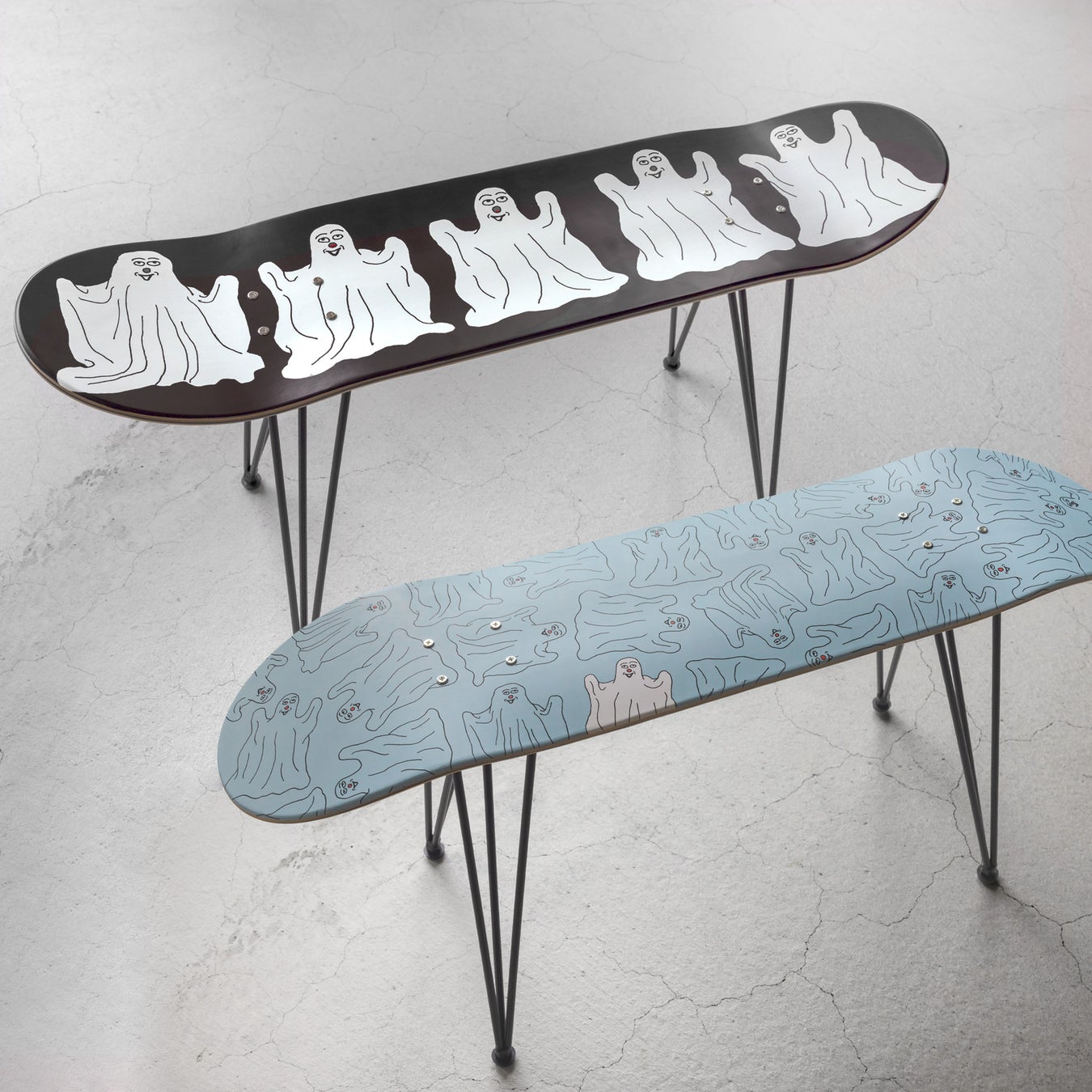 Tシャツ(3種、S~XL展開、税込5,940円)、長袖Tシャツ(2種、サイズ:S~XL展開、税込7,480円)、スウェット(2種、サイズ:S~XL展開、税込8,800円)、パーカー(1種、サイズ:S~XL展開、税込9,900円)、トートバッグ(1種、税込4,400円)、グラス(1種、税込2,750円)、16cmプレート(1種、税込3,520円)、キャンドル(1種、税込3,300円)、ステッカーセット(1種、税込1,650円)、蓄光リバーシブルスケートデッキスツール(1種、税込35,200円 ※受注生産)