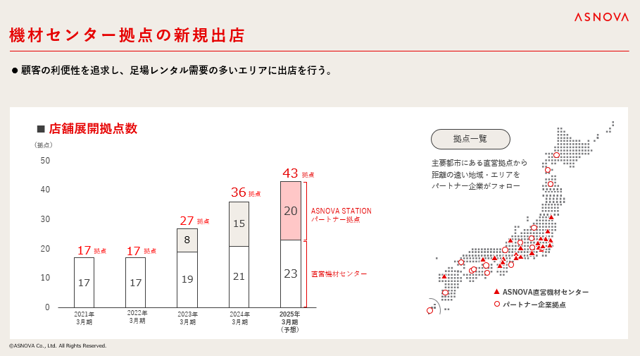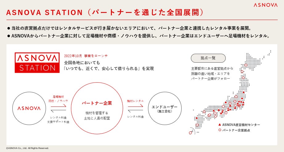 当社は地方への足場レンタルの訴求、また全国へ早急に足場レンタルを展開するために、自社拠点の出店と並行してパートナーを通じた足場レンタルサービス「ASNOVA STATION」を展開しております。