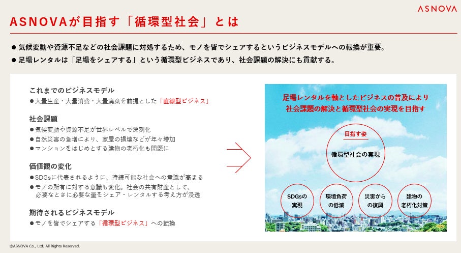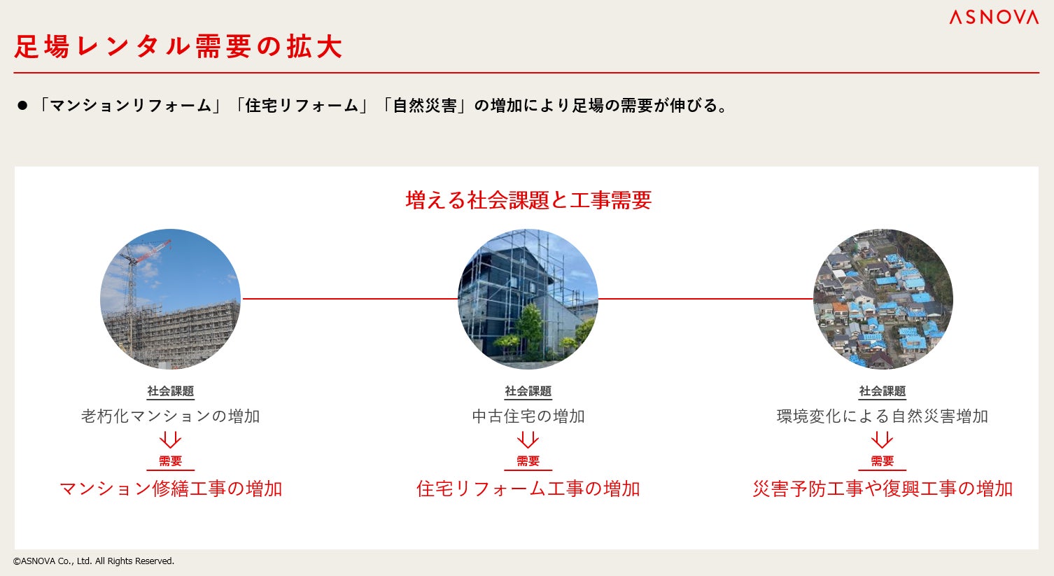 老朽化マンションの修繕需要の増加や生活環境の変化によるリフォーム需要の増加、自然災害の増加など、様々な社会的課題に対して、当社が環境負荷の少ない足場のレンタルビジネスで解決することにより、循環型社会の実現を目指していきたいと考えております。