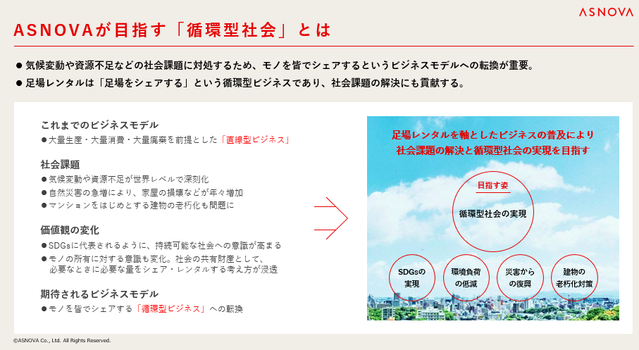 このようなことから、当社が足場レンタルを普及させることで社会課題を解決し、循環型社会の実現に貢献したいと考えております。