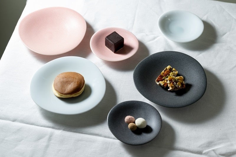 ゆるやかな曲線のラインと、青磁・墨・桜の和の色彩がやさしい雰囲気の小皿。和のお茶菓子やおつまみにはもちろん、普段使いにも。