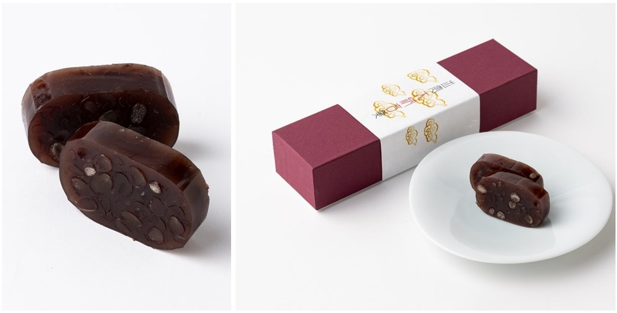 出雲大納言小豆を3日間かけて炊き上げ、蜜漬けし、本練りして仕上げた甘味控えめの羊羹です。出雲の大社地区でとれる藻塩の塩味がきいた出雲大納言小豆の旨味が特徴です。