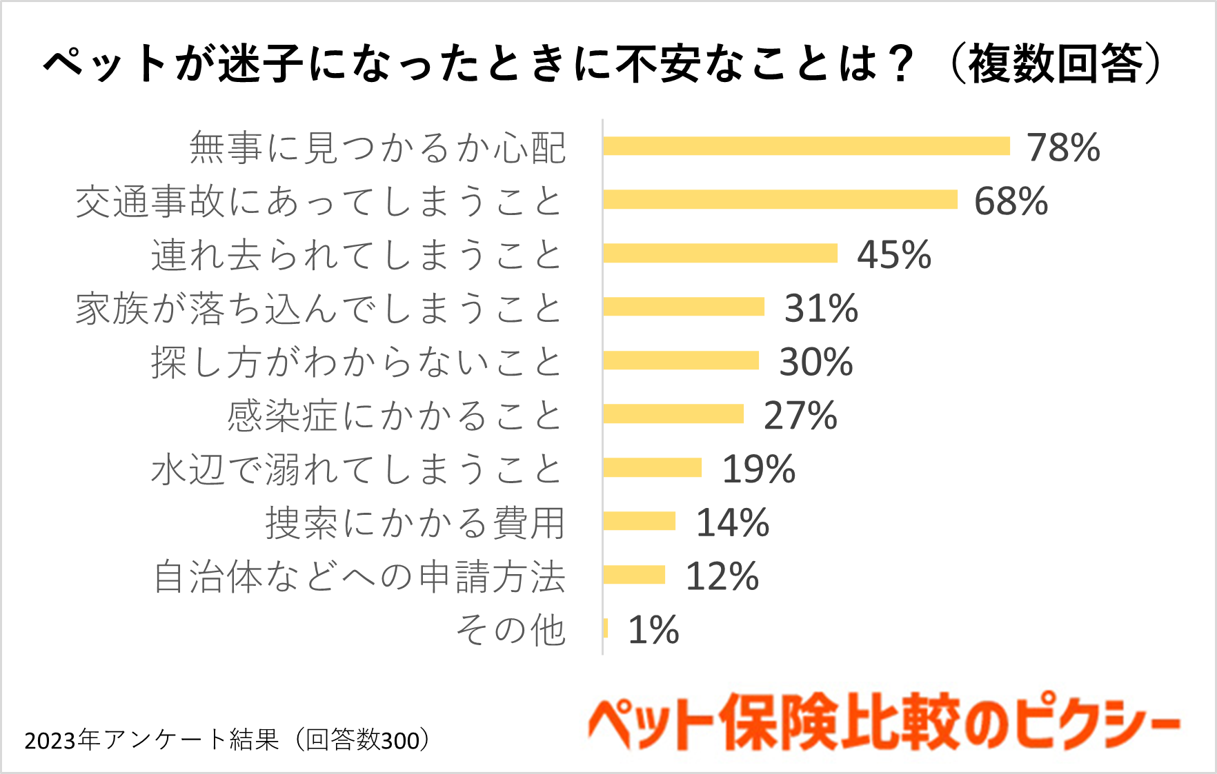 次に、もしもペットが迷子になったときに「不安なこと」をすべて選んでもらいました。