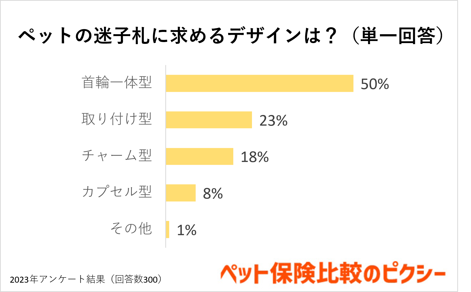 最後に、ペットの迷子札に求めるデザインを質問したところ、1位は「首輪一体型」で50%から選ばれました。