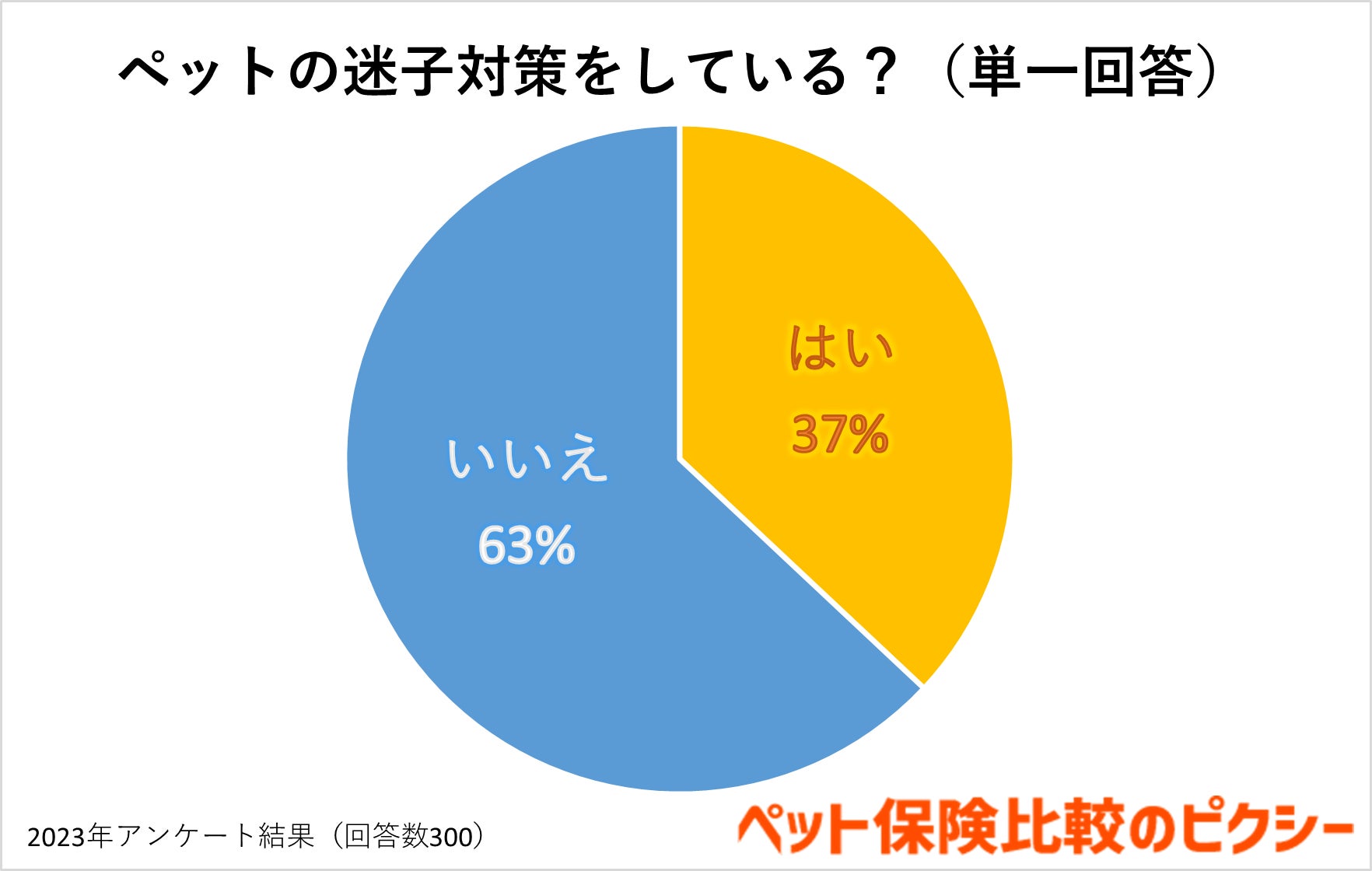 ペットの迷子対策をしているか質問したところ、「はい(迷子対策をしている)」が37%、「いいえ(迷子対策をしていない)」が63%と、迷子対策をしていない方が6割以上となりました。