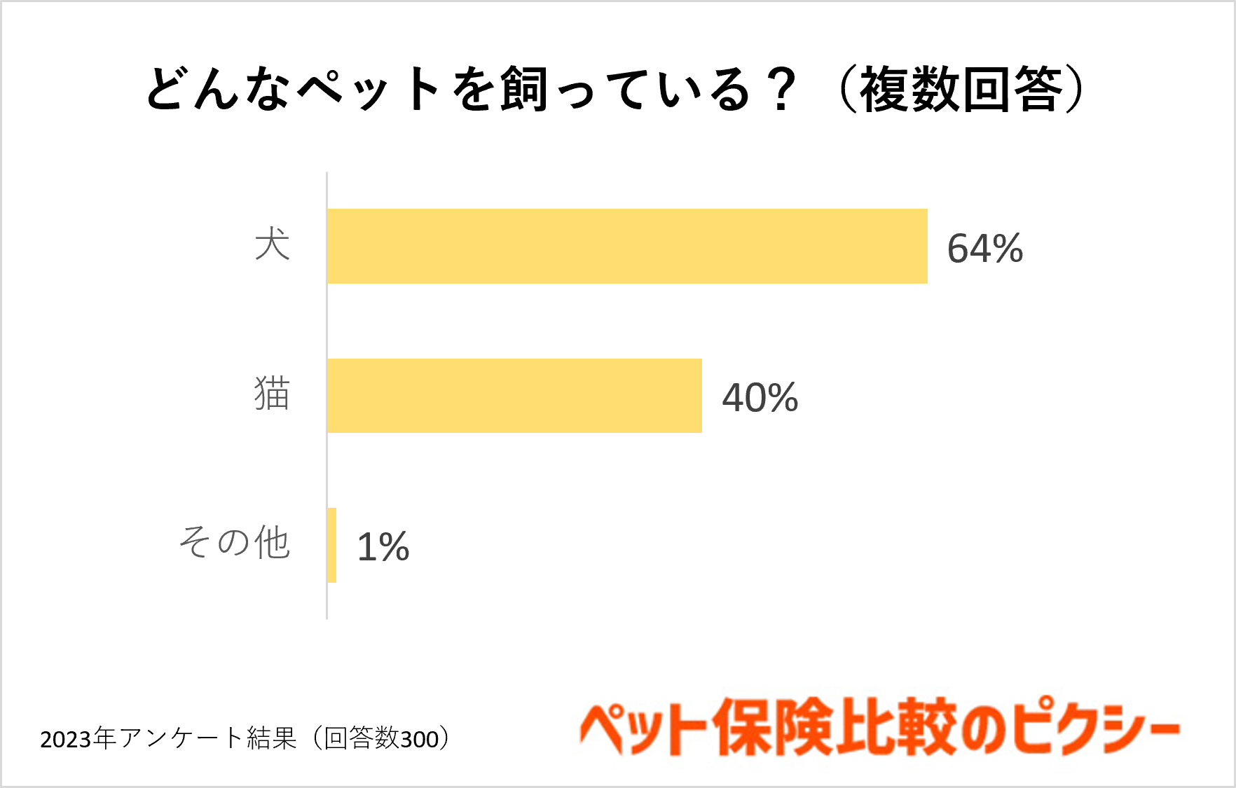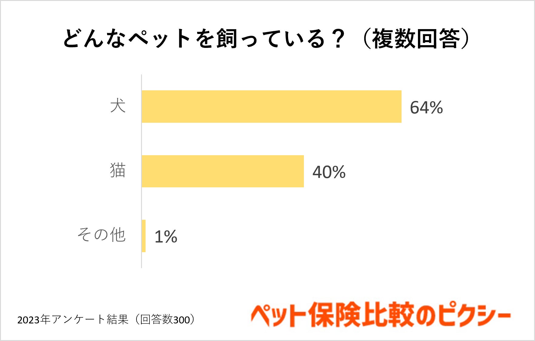 まず、どのようなペットを飼っているのかを聞いたところ、犬を飼っている方が64%、猫を飼っている方が40%、その他が1%という結果でした。