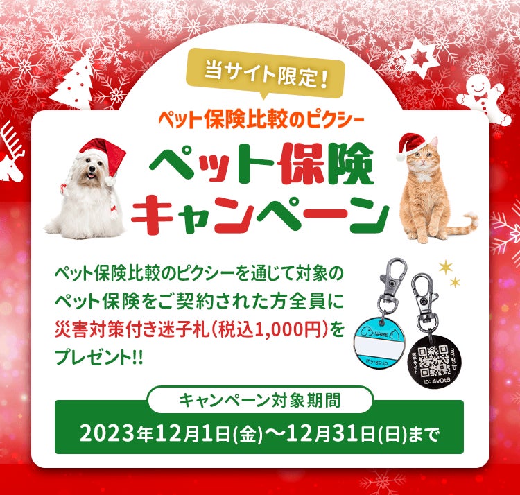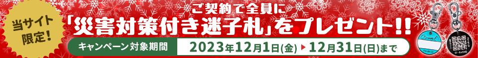 当サイト限定!2023年12月1日〜31日まで、当サイト経由で対象保険会社のペット保険をご成約された方全員に犬猫用の災害対策付き迷子札をもれなくプレゼント!