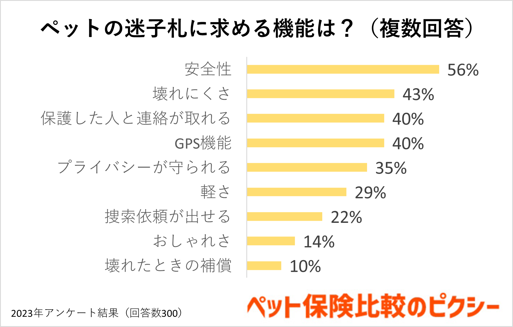 ペットの迷子札に求める機能をすべて選んでもらったところ、1位は「安全性(56%)」、2位は「壊れにくさ(43%)」でした。