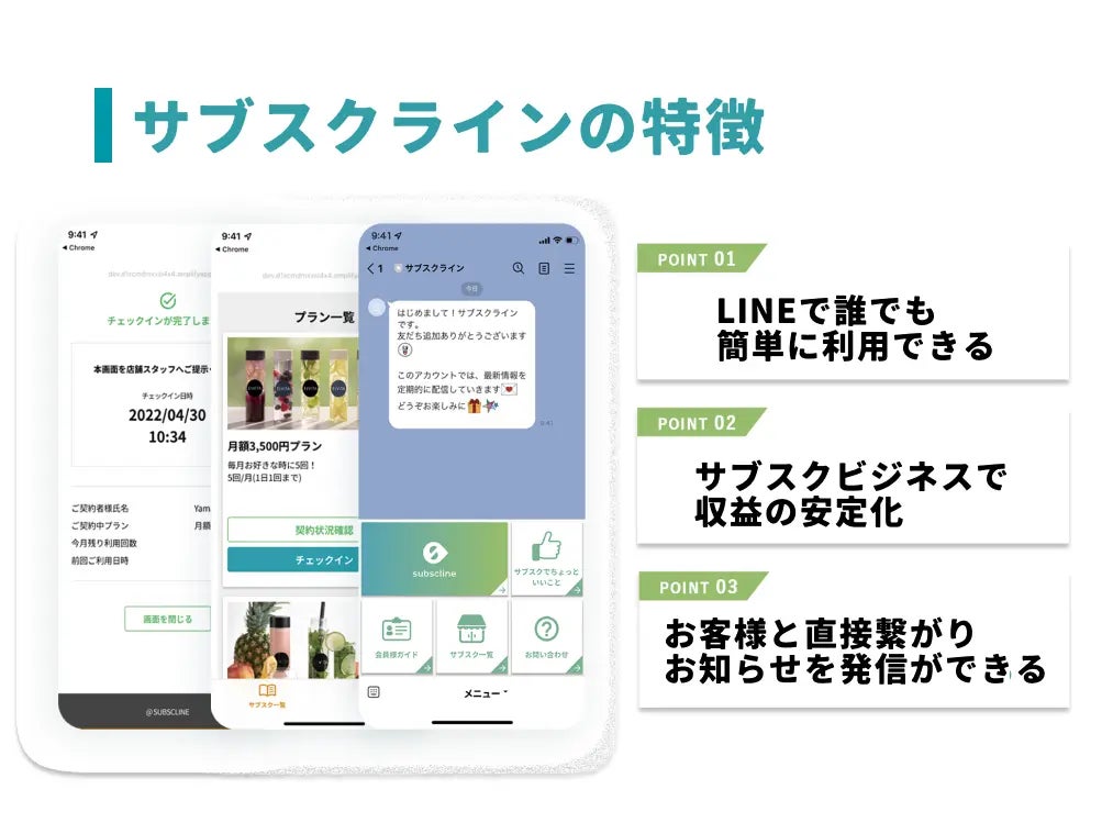 「サブスクライン」は、LINEからの決済に特化したオールインワンSaaSです。LINE上で自店舗オリジナルのサブスクリプション型サービス(月額制サービス)や、単回決済型のサービス、モバイルオーダー・オンラインストア等の機能を簡単に提供、一元管理できるシステムです。