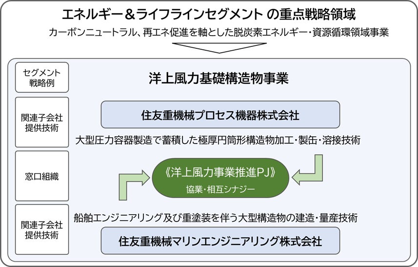 カーボンニュートラル実現に向けた洋上風力発電領域においては、主に住友重機械プロセス機器株式会社(以下、住友重機械プロセス機器)および住友重機械マリンエンジニアリング株式会社(以下、住友重機械マリンエンジニアリング)が、着床式/浮体式いずれの基礎構造物製造にも転用可能な技術を多く保有しているため、当社のエネルギー&ライフラインセグメントに「洋上風力事業推進プロジェクト」を新設し、これらの技術を事業化に向けて統括していくこととしました。