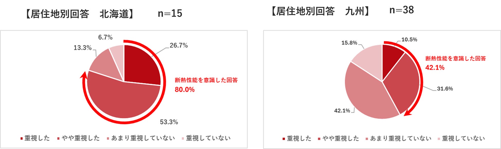 また、回答者の居住地別の回答を見てみると、気温の低い北海道では断熱性能を「重視した」「やや重視した」と回答した人が合計80%と高い数値を示しましたが、比較的温暖な気候と言われる九州では42.1%に留まり、居住地の気候による意識の違いが見える結果となりました。