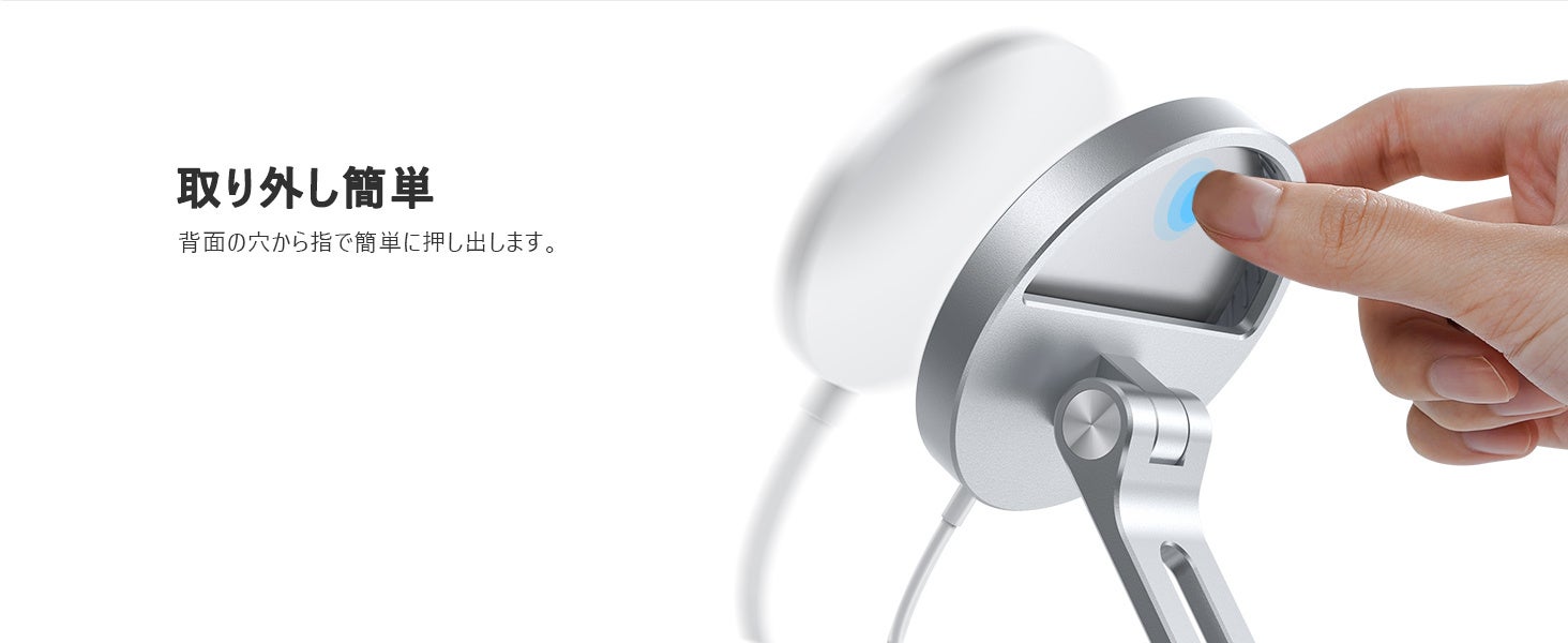 本製品はMagSafe充電器を表側から取り付け、スマホを立てかけるだけで簡単に使用できます。ワイヤレス充電器の中には取り外しがしにくいものもありますが、本製品は背面からスマホを押し出すだけなので、複雑な操作は必要ありません。充電器がしっかりセットされるため、スマホだけを充電器から取り外す際もスムーズです。