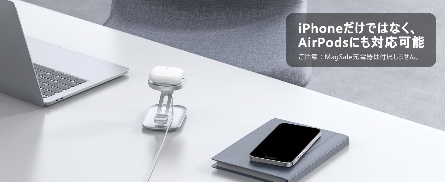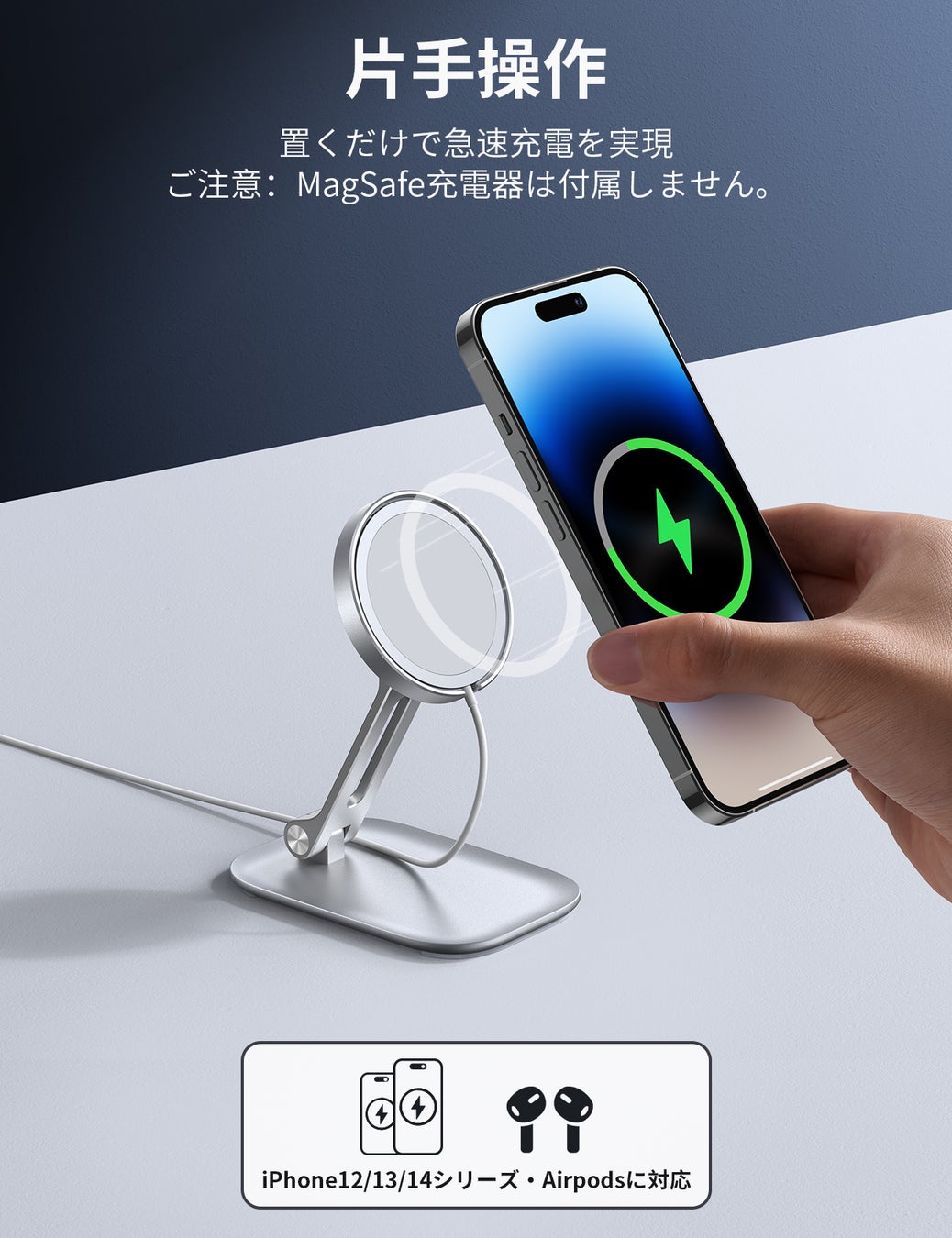 *本製品はMagSafe充電器をはめ込んで使用する設計となっているため、スタンド単体で充電することはできません。充電器は付属しておりませんので、ご自身でお使いのものをご利用ください。