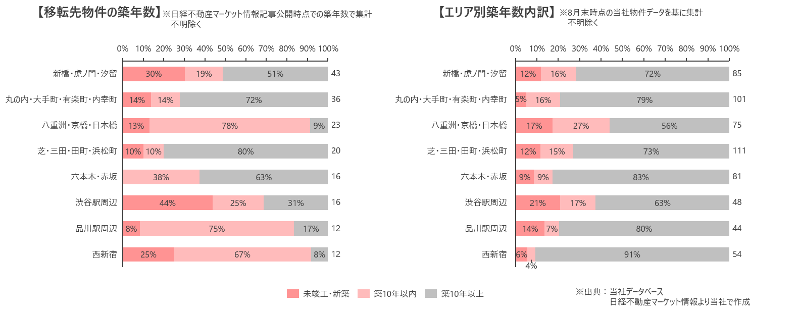 他方、西新宿エリア、品川駅周辺エリアへの移転では、「未竣工・新築」、「築10年以内」ビルへの移転の割合が高かったものの、当該エリアにおいては「未竣工・新築」、「築10年以内」ビルの割合は低く、一部の比較的新しいビルに移転が集中していると推察される。