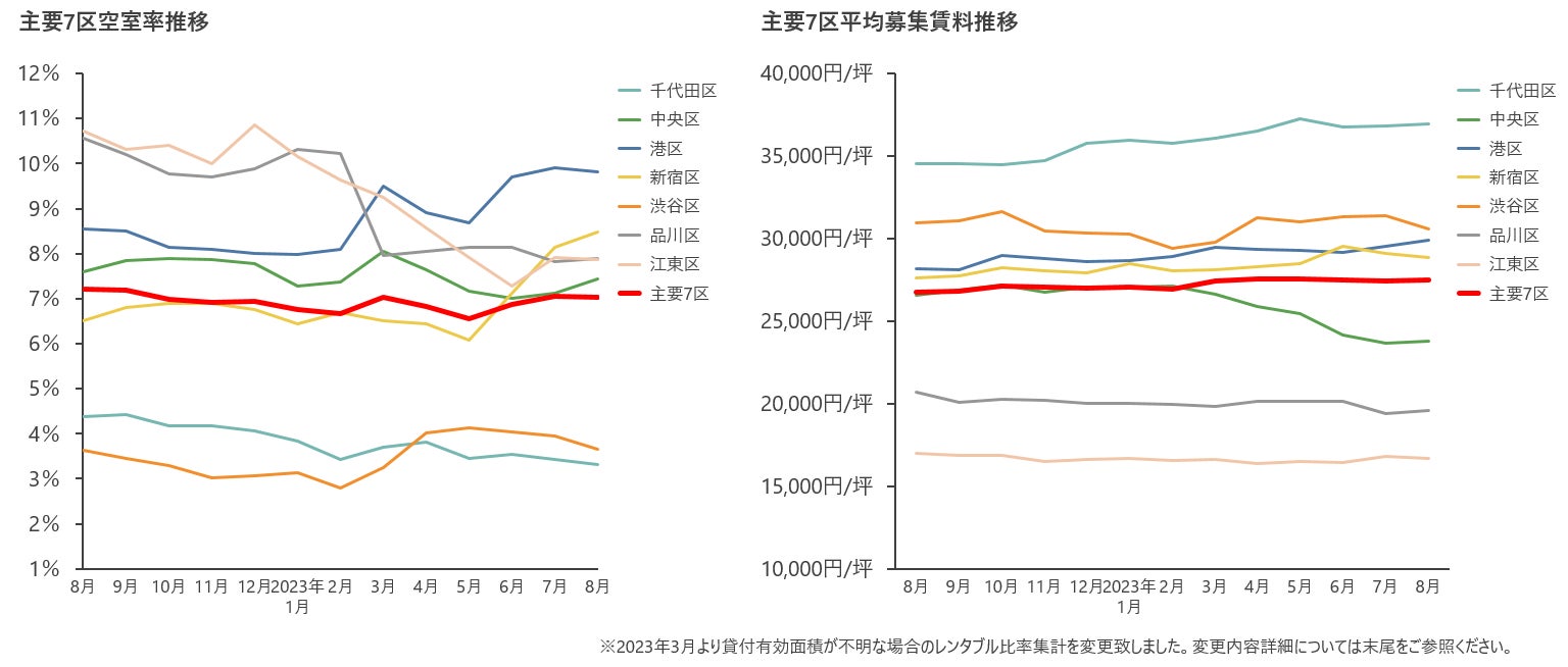 <2023年8月末時点>東京主要7区 大型オフィスビル空室・平均募集賃料調査