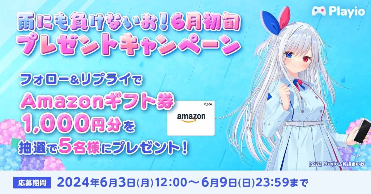 公式X(旧Twitter)@Playio_io内にてアプリ内イベント「雨にもまけないお!6月初旬プレゼントキャンペーン」を開催します。抽選で5名の方に「Amazonギフト券1,000円分」をプレゼントいたします。詳細は「Playio」公式X(旧Twitter)@Playio_ioをご確認ください。