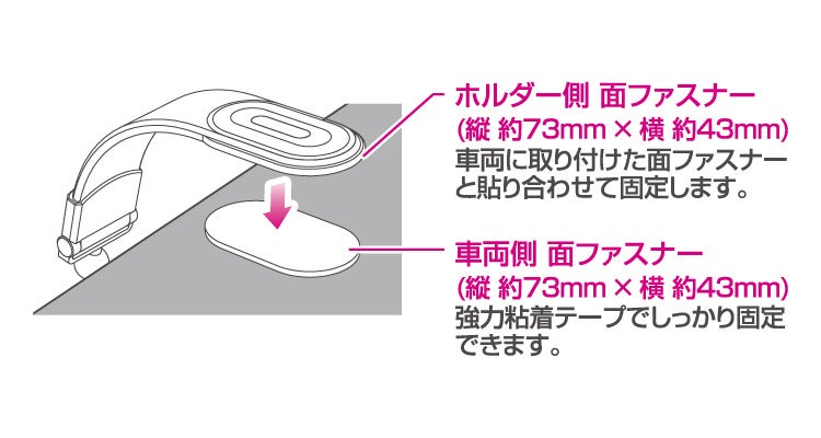 両タイプともに走行時の振動による揺れを軽減するアーム補助ステー、貼付け時の汚れや油分を清掃できる脱脂用アルコールパッド、車両側の傷を防止する傷防止パッドが付属しています。