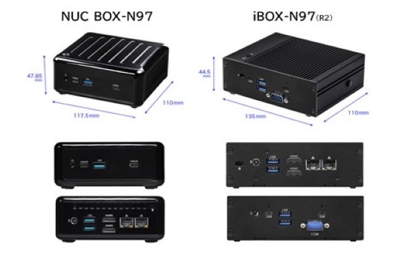 「N97シリーズ」は、廃熱ファンを搭載したコンパクト筐体の「NUC BOX-N97」、ファンレスでCOM