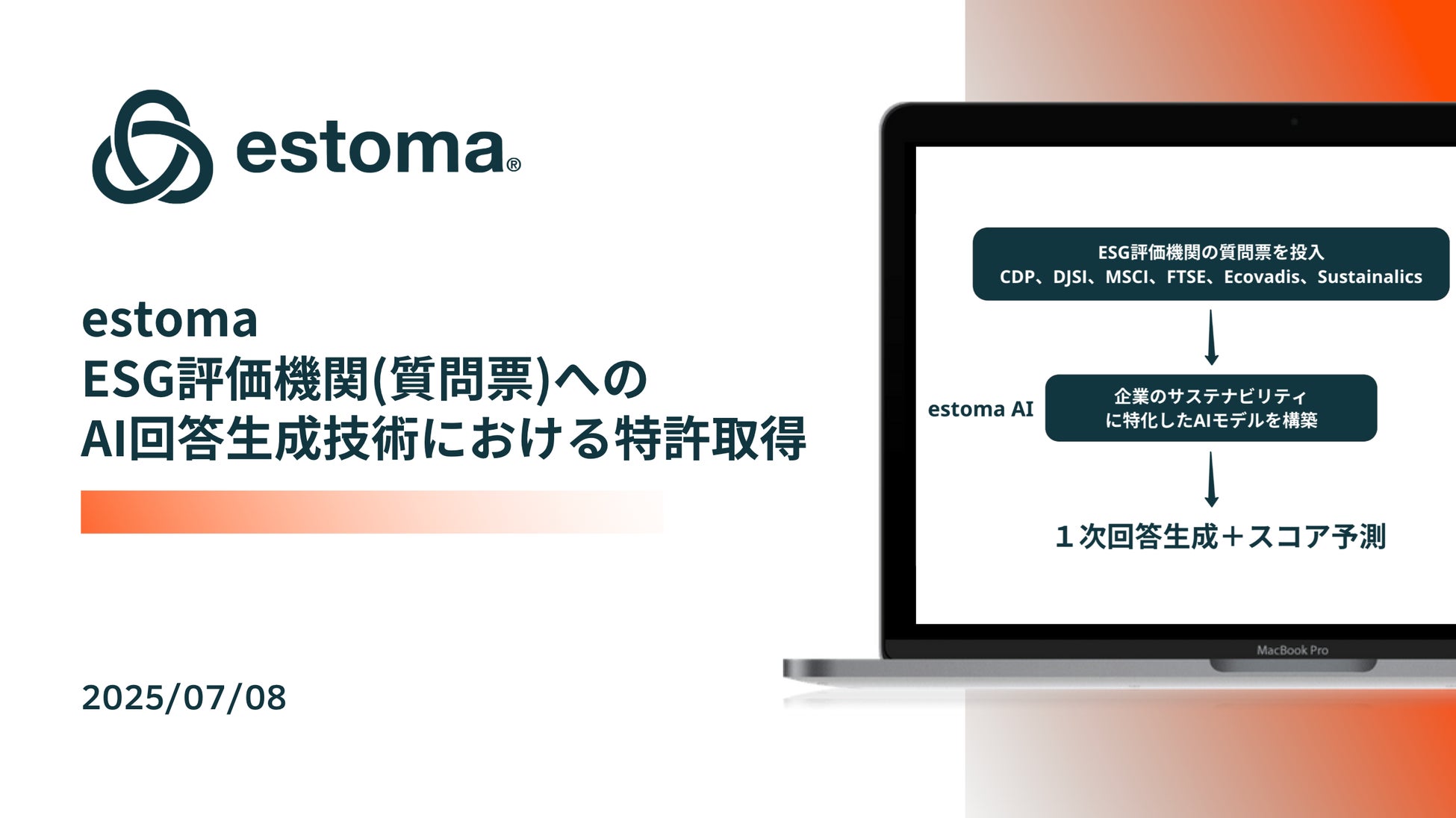 株式会社estoma(本社:東京都千代田区、代表取締役:伊藤総一郎、以下「estoma」)は、当社が開発するESG情報開示支援クラウド「estoma(エストマ)」に搭載されたAIによるESG回答自動生成システムに関する特許(特許公開番号:JP2025-39443)を取得いたしました。ESG質問への回答作業を効率化・自動化する本技術で企業の国際的なESG評価向上を支援し、社会全体のサステナビリティ推進に貢献してまいります。
