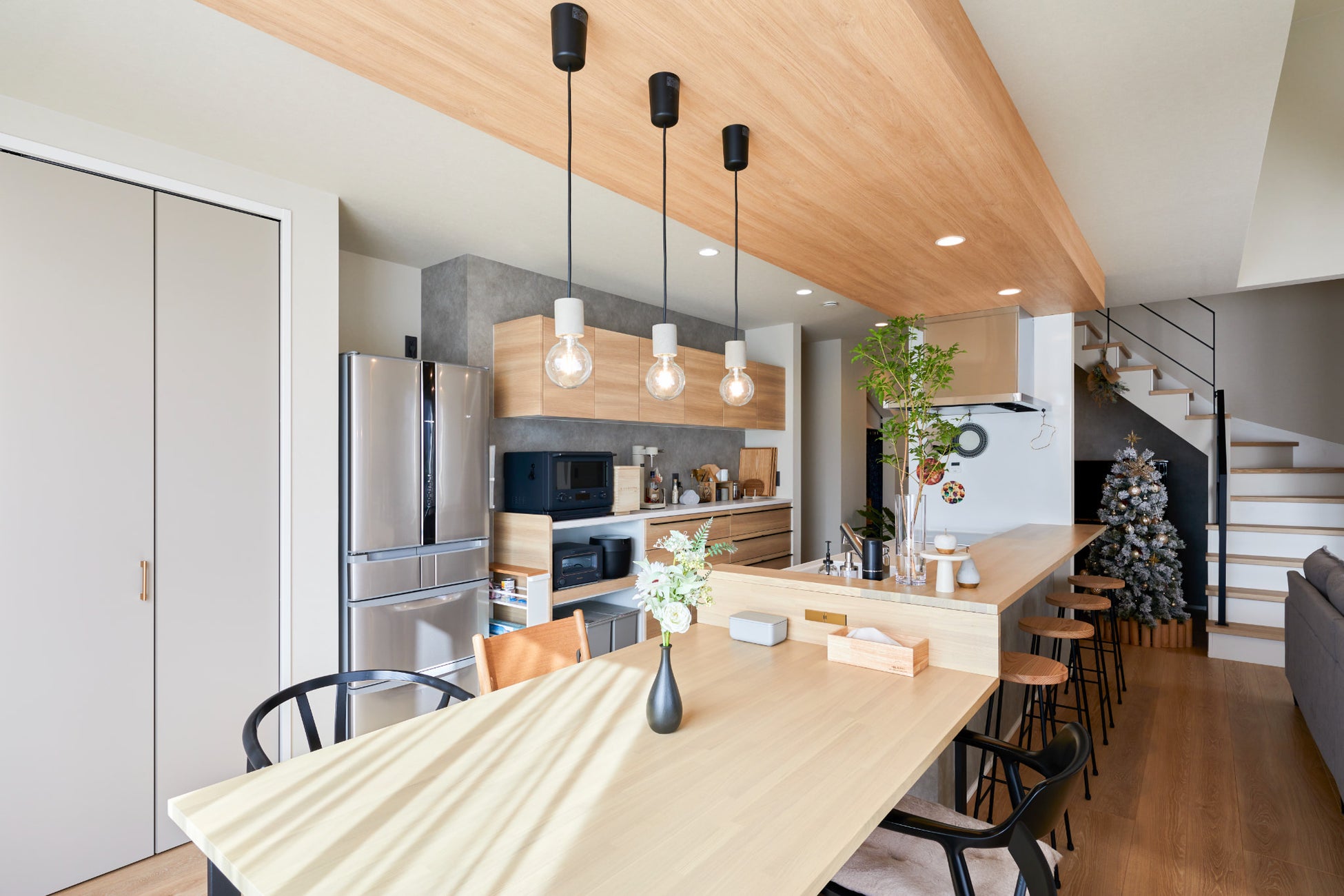 お酒やティータイムを愉しむことができる造作カウンターをキッチン前に設置。料理をしながらでも対面で会話ができます。またカウンターはダイニングまで一体で成形しているような造りになっているため空間にまとまりがでています。木目で合わせつつ一部を折り下げ天井とすることで非日常感のある空間に仕上げました。