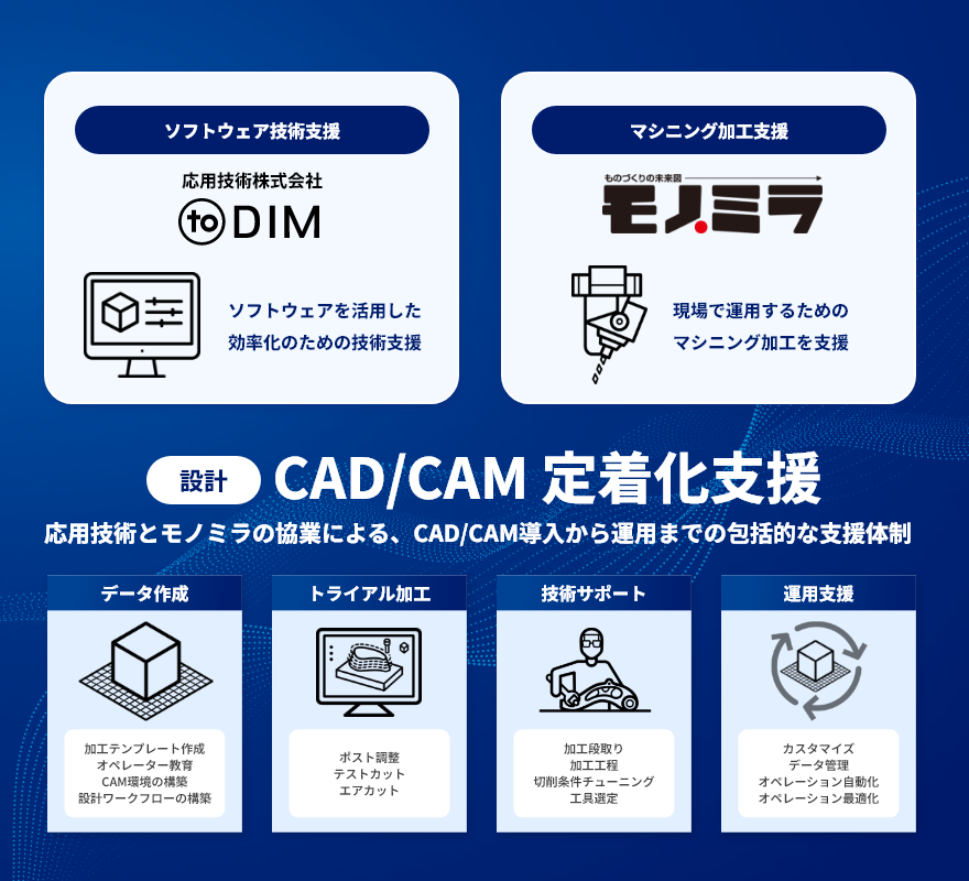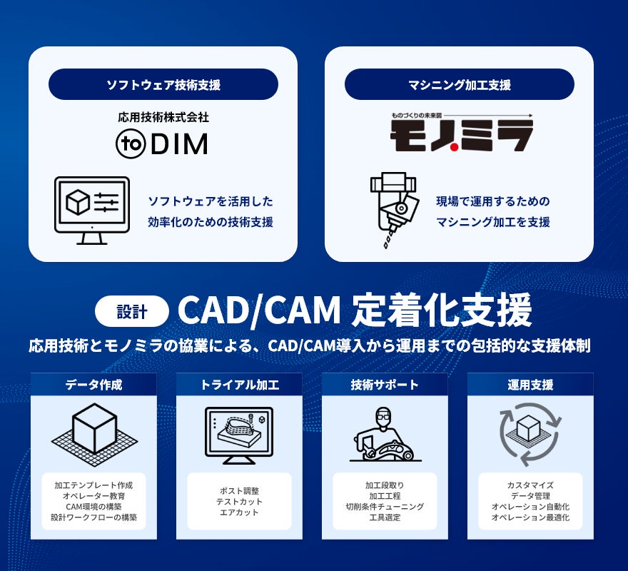 本協業により、応用技術の持つソフトウェアによる効率化技術と、モノミラが持つ現場運用・加工ノウハウを融合し、Autodesk Fusionを中心としたCAD/CAMの導入から、現場での実運用、加工の自動化までをワンストップで支援する体制を構築いたします。