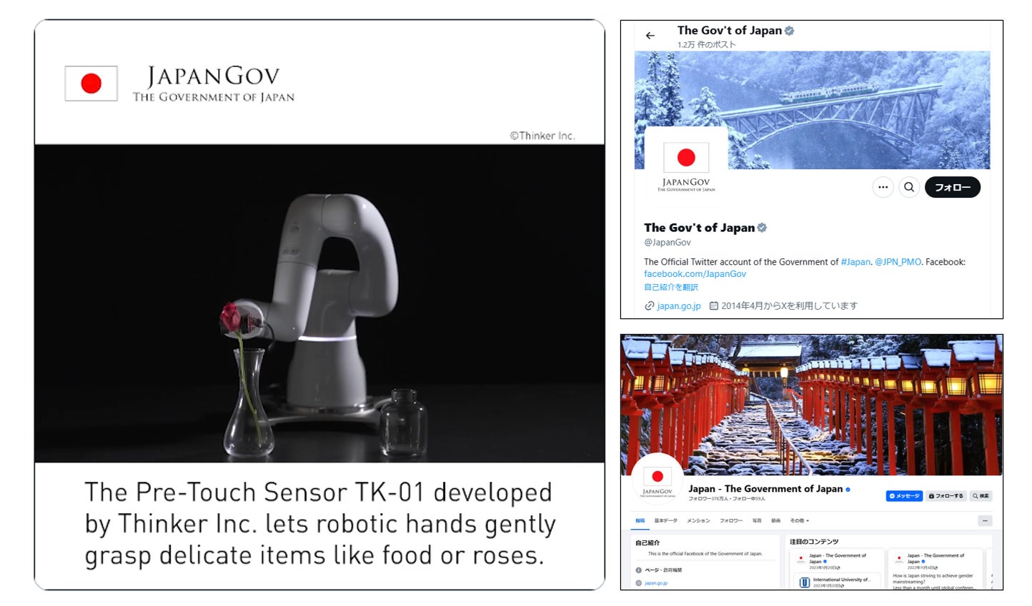 「ロボットハンドの民主化」に取り組む株式会社Thinker(読み:シンカー、本社:大阪府大阪市、以下Thinker)が、日本政府の公式SNSアカウント「JAPAN Gov」で、日本のイノベーション事例(#InnovationJapan)に選ばれ、世界に向けて紹介されました。「JAPAN Gov」は日本政府が世界に向けて日本の魅力、文化、技術などを発信する公式アカウントで、Facebookは376万人、Xは48.6万人、LinkedInは22.7万人のフォロワーを有しています(2025年2月7日時点)。