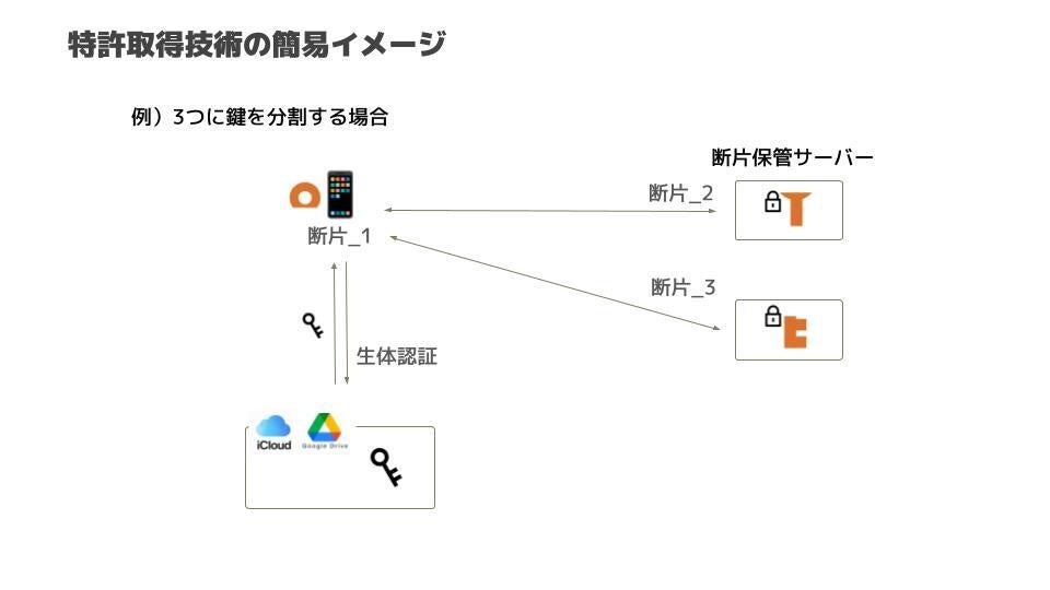 秘密情報を複数の「断片」に分割し、これらの断片を自分の端末と複数の外部サーバーに分散して保存します。情報を復元するためには、一定数の断片を集める必要があり、これにより情報の完全性を保ちます。さらに、生体認証(指紋や顔認証など)を導入することで、外部サーバーから断片を取得する際の不正アクセス防止が可能です。このシステムにより、1つのサーバーが攻撃された場合でも全ての情報が漏洩するリスクが低減され、高度なセキュリティが実現されます。