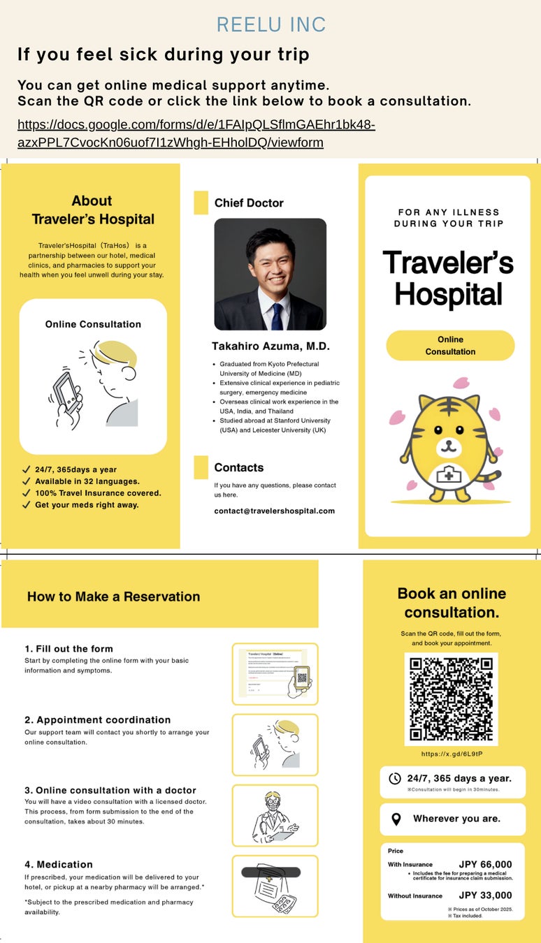 株式会社Reelu(本社:東京都港区、代表取締役:今野珠優)は、同社が企画・運営する訪日ガイド団体「Reelu Japan Guide」において、オンライン多言語診療サービス『Travelers Hospital(とらほす)』を導入したことをお知らせいたします。