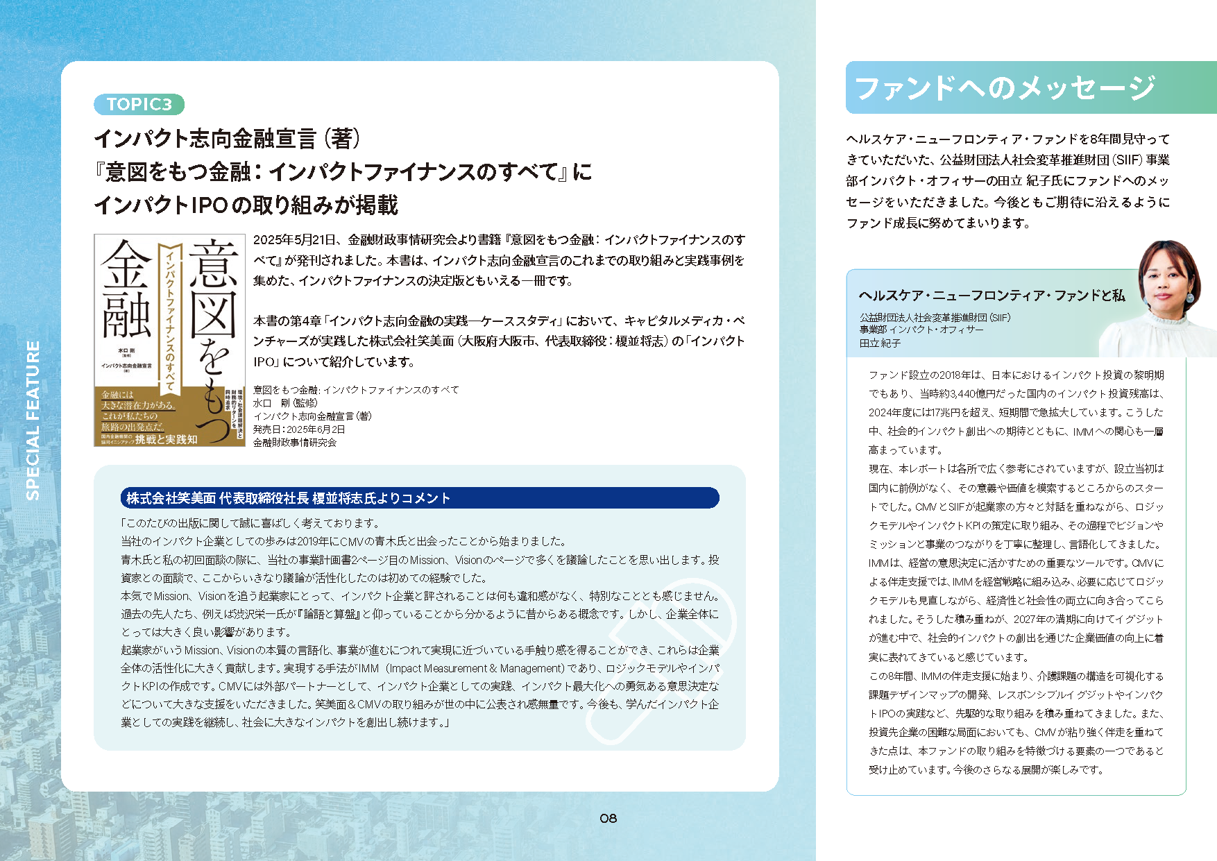 『意図をもつ金融: インパクトファイナンスのすべて』(水口 剛(監修)、インパクト志向金融宣言(著)、発売日:2025年6月2日、金融財政事情研究会)にて、同ファンドによるインパクトIPOの事例が掲載。