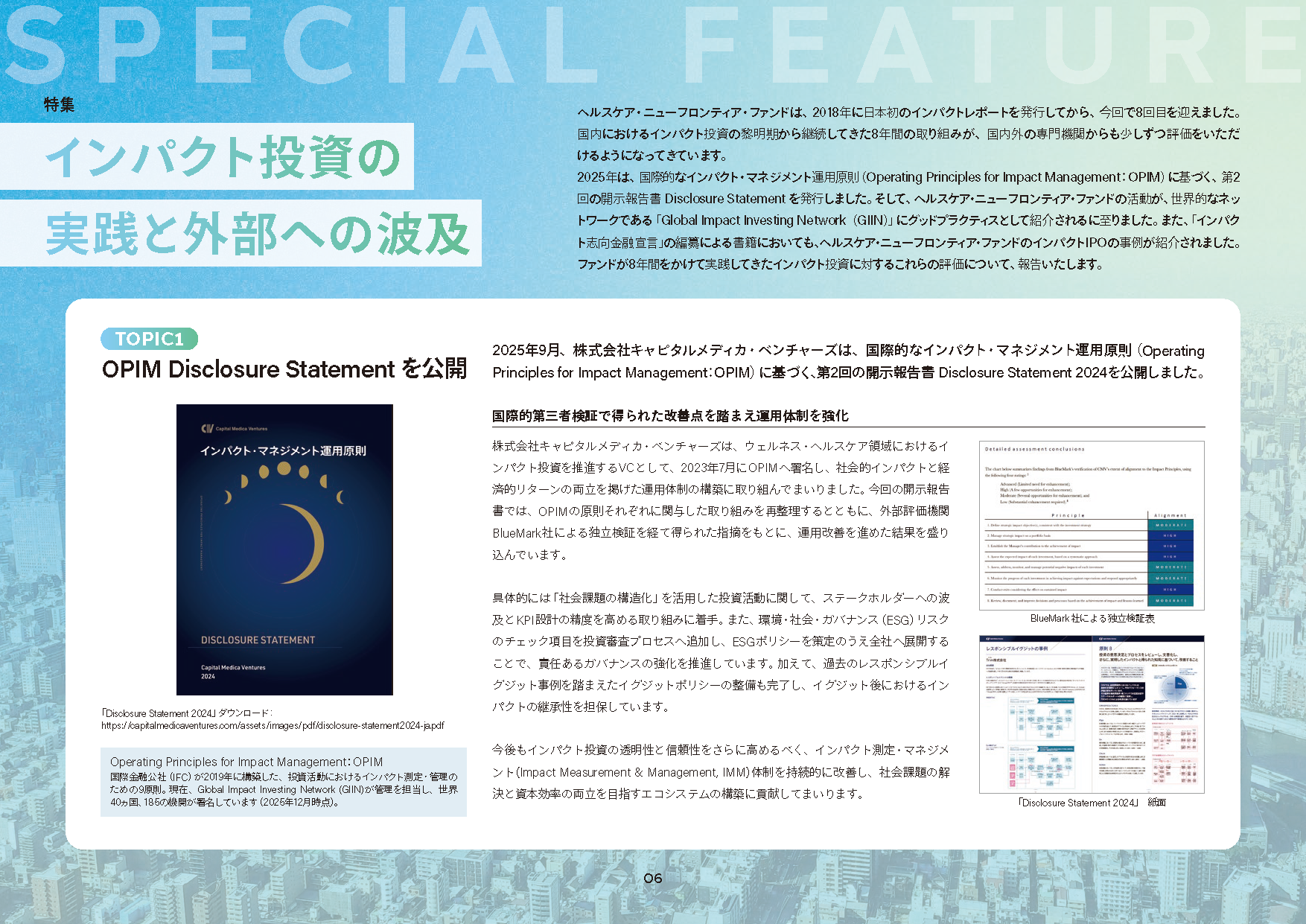 また、今回は「インパクト投資の実践と外部への波及」と題した特集を組み、2017年の創刊より8年にわたり蓄積してきた同ファンドの取り組みが、国内外の専門機関からどのように評価されているか、その変遷と現状をまとめています。