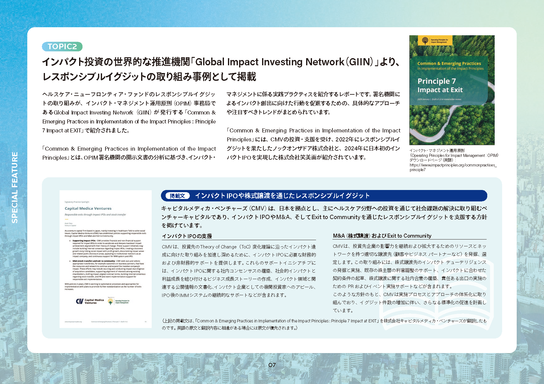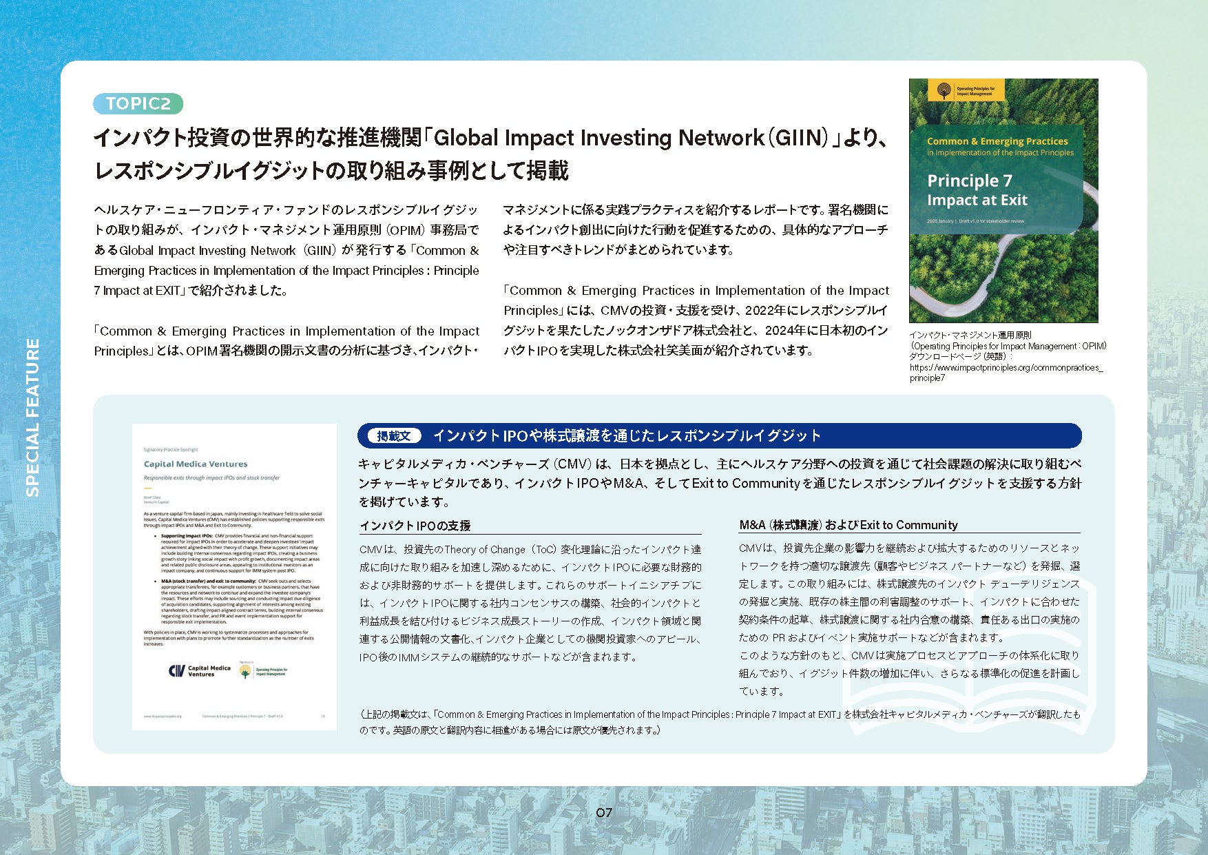 世界的なネットワークであるGlobal Impact Investing Network(GIIN)の「Common & Emerging Practices in Implementation of the Impact Principles : Principle 7 Impact at EXIT」が、同ファンドのレスポンシブルイグジットの取り組みをグッドプラクティスとして紹介。