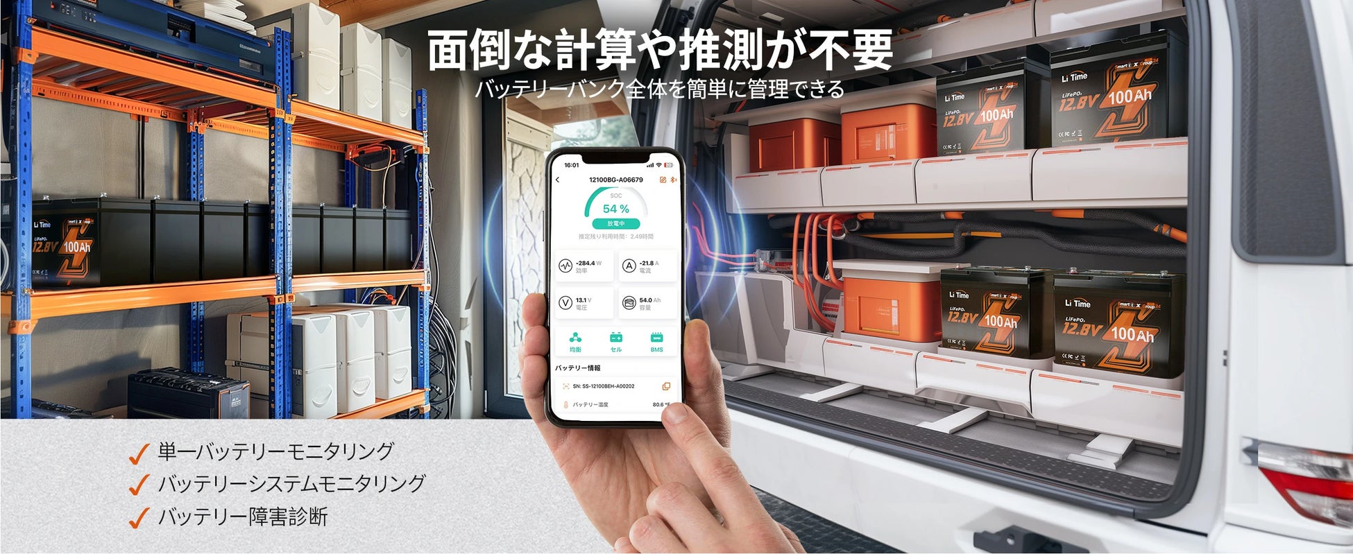 Bluetooth 5.0で簡単管理:自動接続&専用アプリで複数バッテリーの状態をリアルタイム監視。