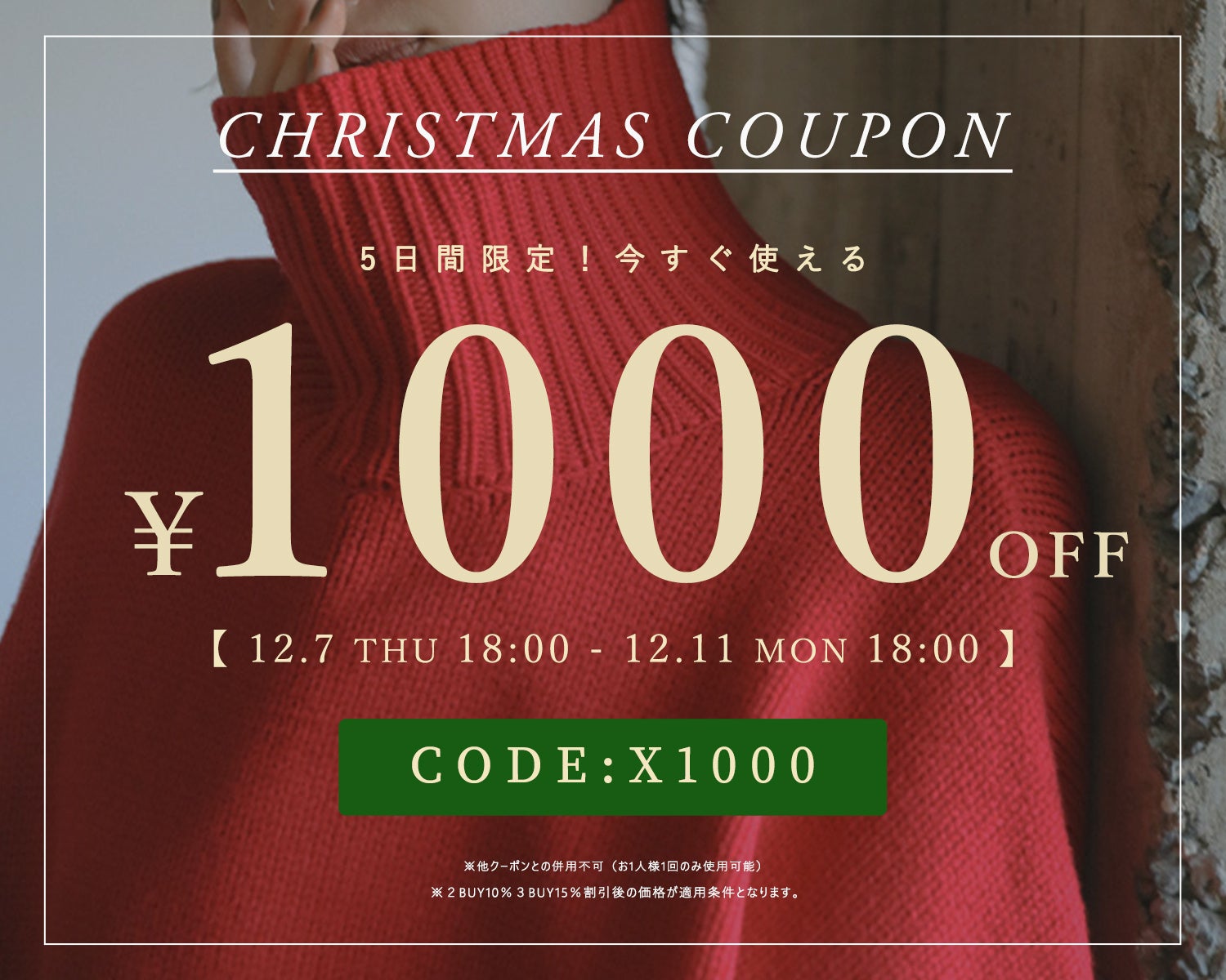 12/7(木)18:00~12/11(月)18:00までの期間中、税込10,000円以上お買い物していただいたお客様に1000円OFFクーポンをプレゼントさせていただきます。