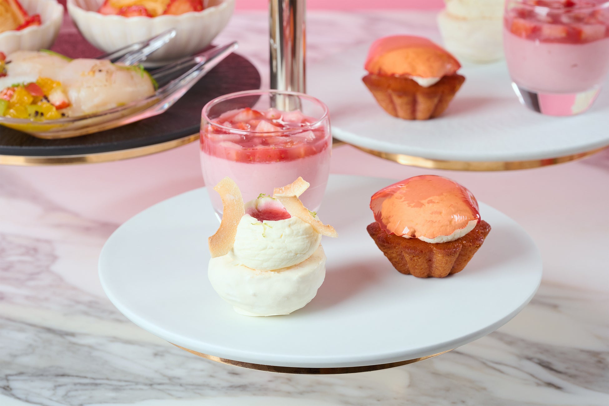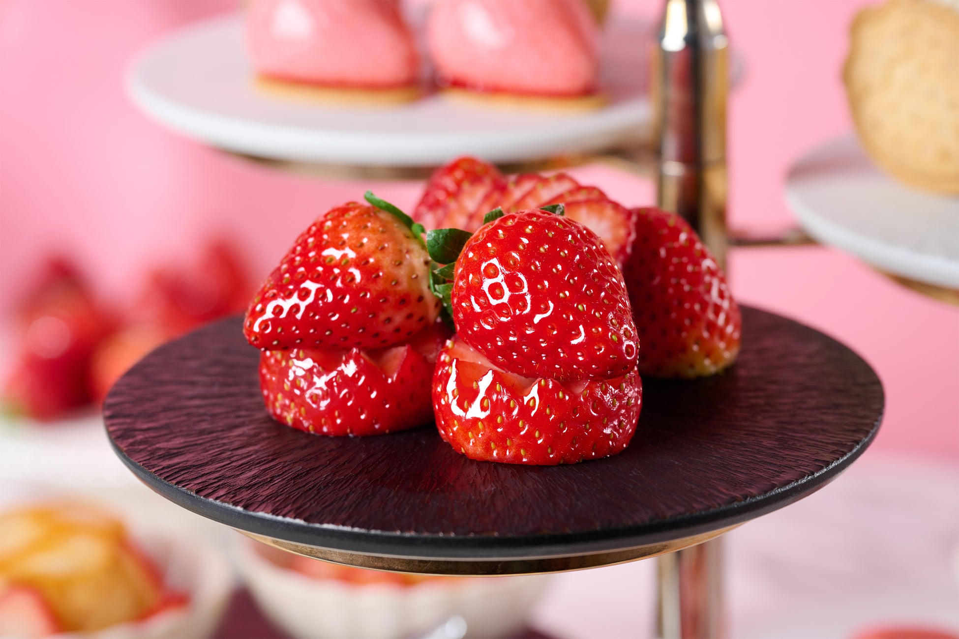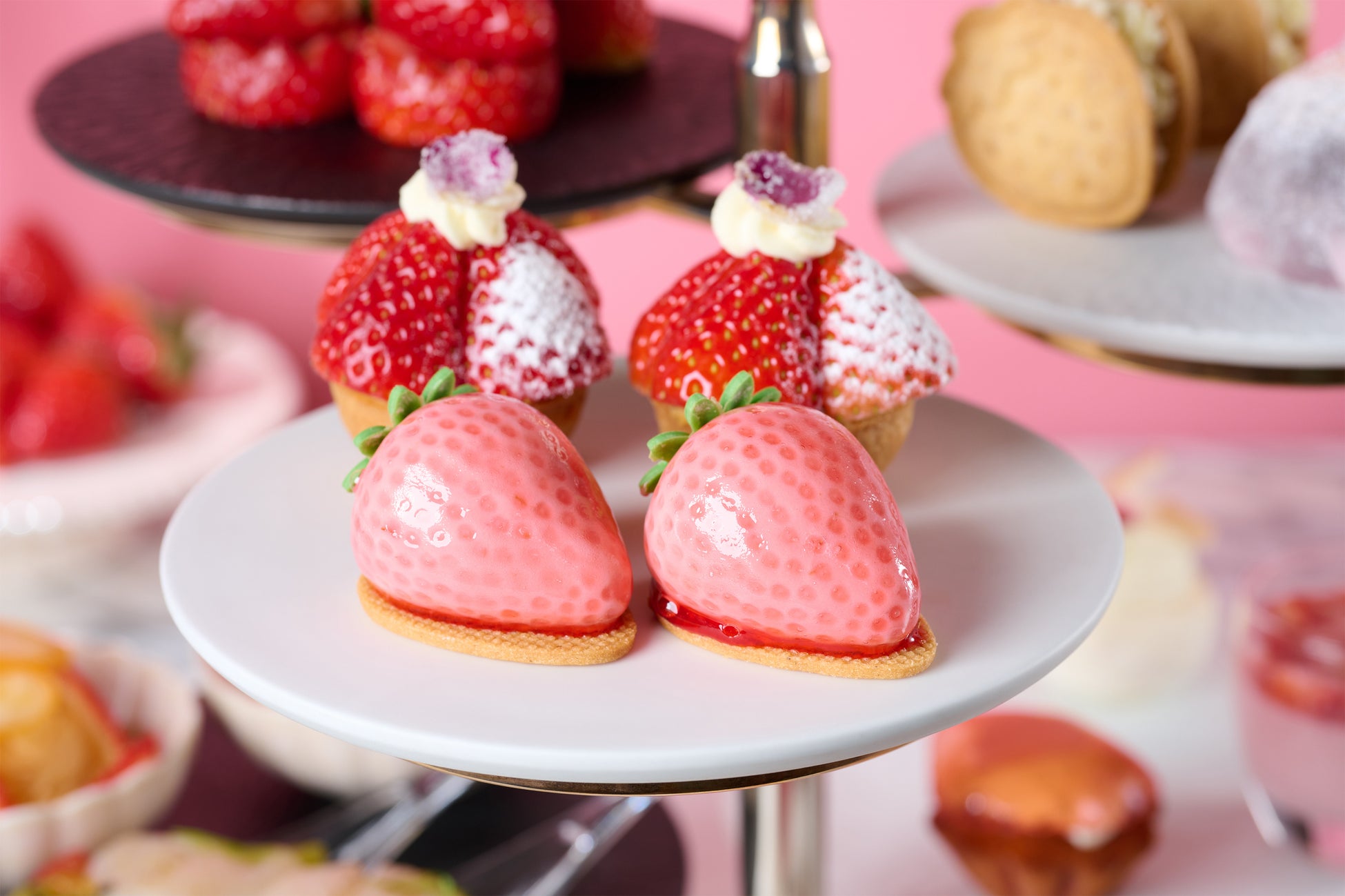 6段スタンドを彩るのは、それぞれのいちごが持つ個性を引き出した7種のスイーツと2種のセイボリー。品種ごとの甘みや酸味、香り、食感の違いを楽しめる、いちごづくしのセレクションです。