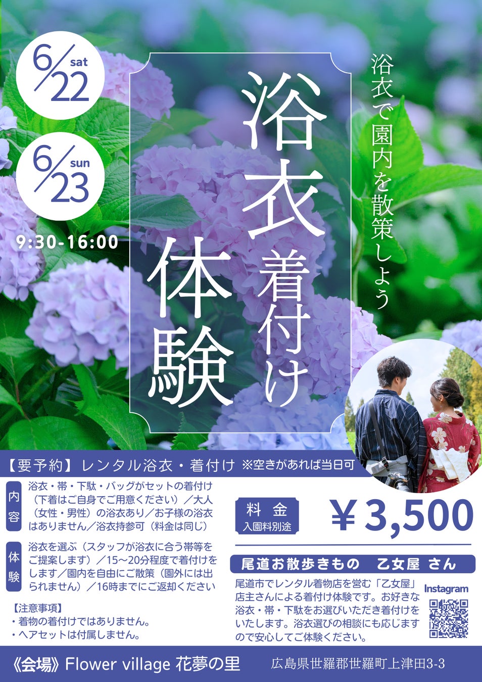 開催中のFlower village 花夢の里「あじさいとタチアオイの丘」では、浴衣で散策できる着付け体験を2日間限定で開催します。