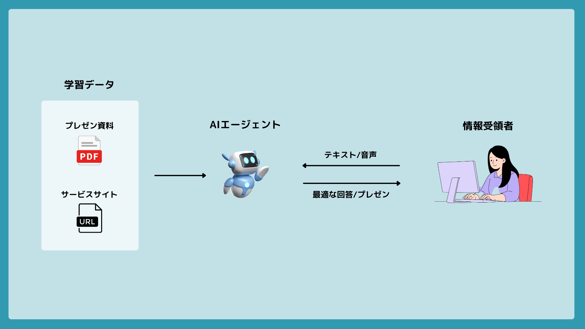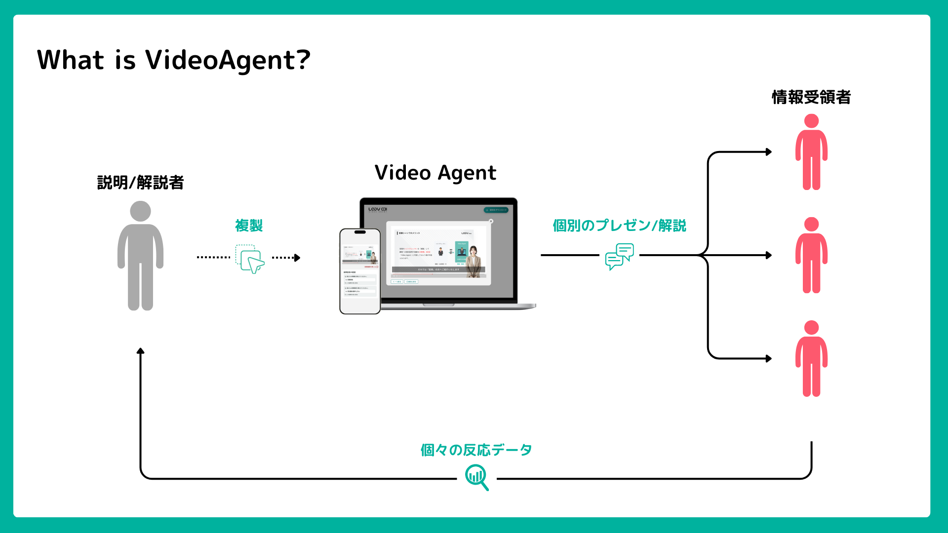 Video Agentは、AIを活用して“人が話す”ようなプレゼンテーションや解説を自動で行うソリューションです。営業資料の説明、カスタマーサポート、PR、IR活動、社員教育、オンボーディング、さらには採用活動まで、幅広い分野で活用可能です。これからの企業活動において、「伝える」ことをもっとスマートに、もっと効果的に。Video Agentがその未来を支えます。