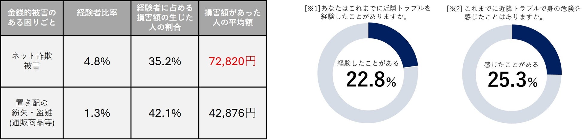 近年、近所付き合いの希薄化やSNSの広がり等をきっかけとした近隣トラブルやネットトラブルは増加傾向にあります。当社の調査では、約5⼈に1⼈(22.8%)が近隣トラブルに遭った経験があり[※1]、またそのうちの約4⼈に1⼈(25.3%)が近隣トラブルで⾝の危険を感じたことがある[※2]と回答しています。