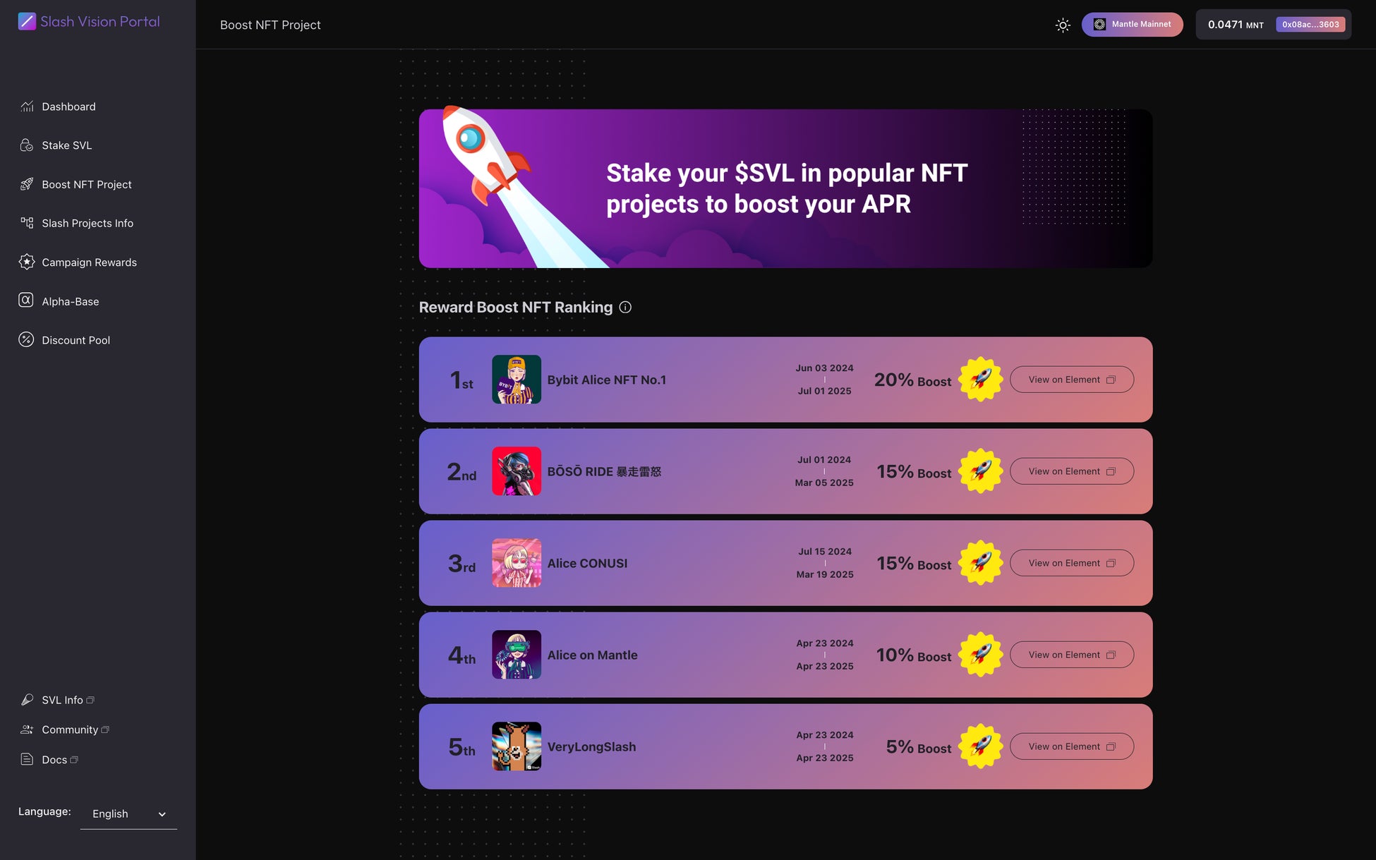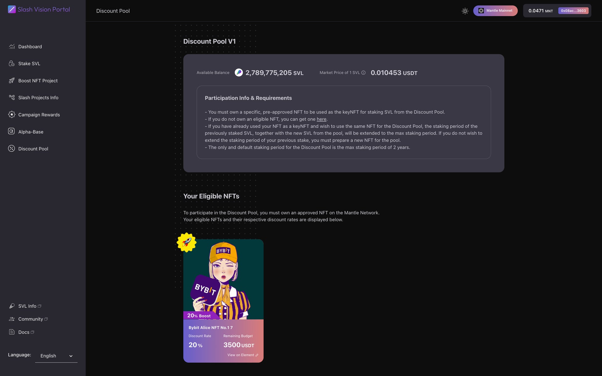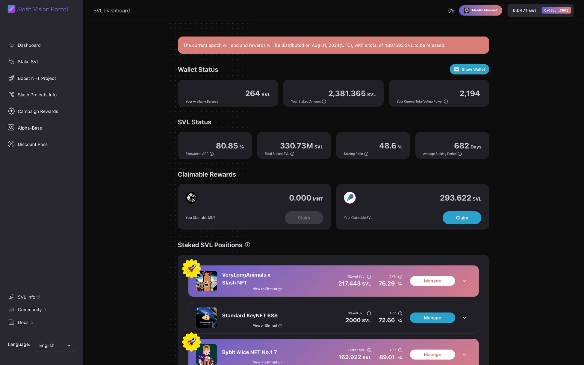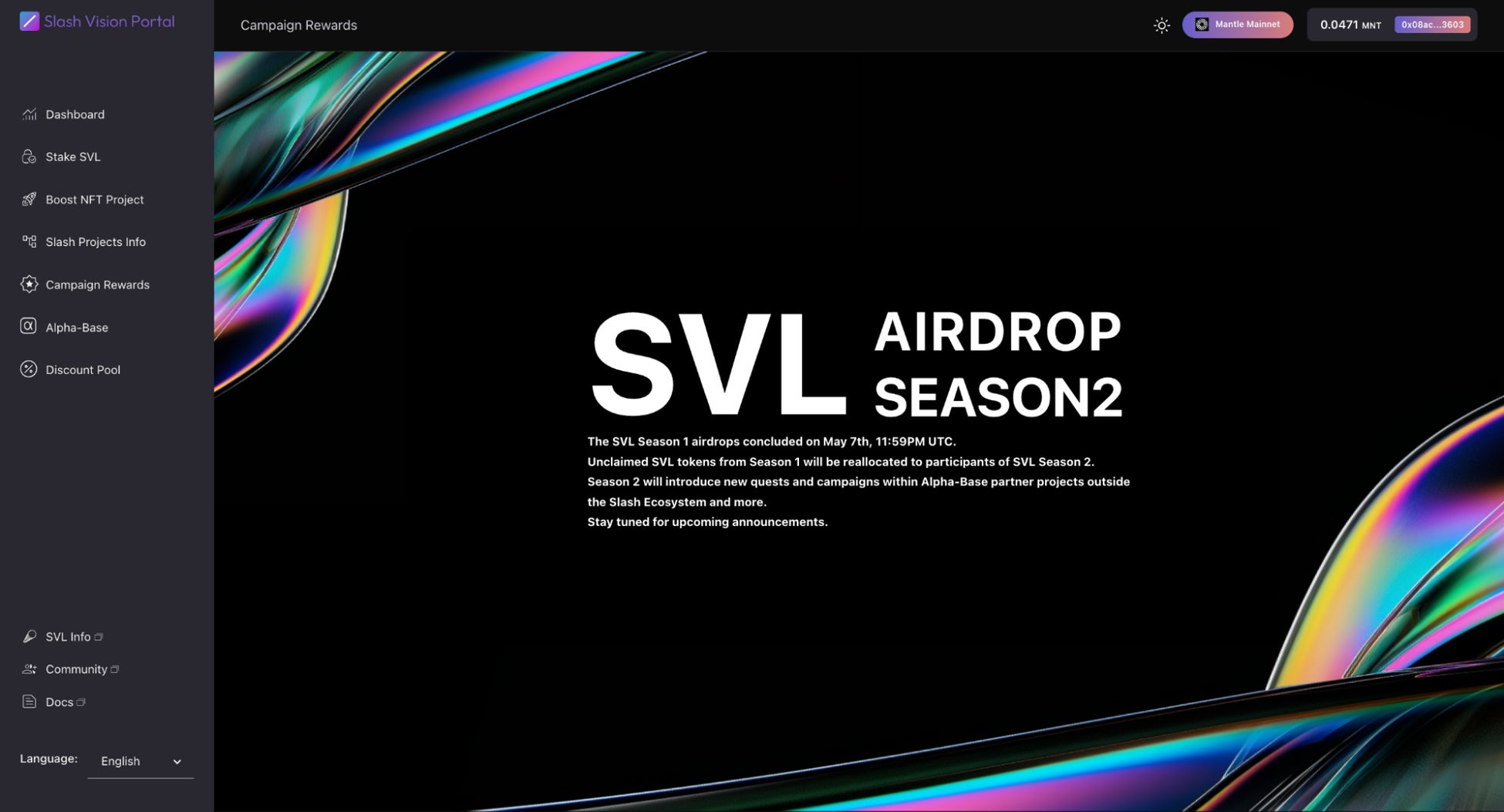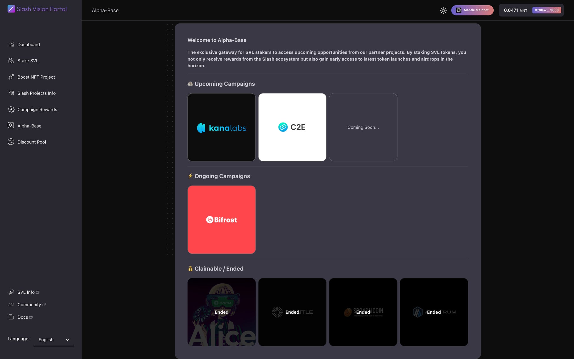 ・Alpha-Base:SVLトークンをステーキングすることで、パートナープロジェクトからの今後の機会にアクセスするための独占的なゲートウェイです。SVLトークンをステーキングすることで、Slashエコシステムからの報酬を受け取るだけでなく、最新のトークンローンチやエアドロップへの早期アクセスも得られます。