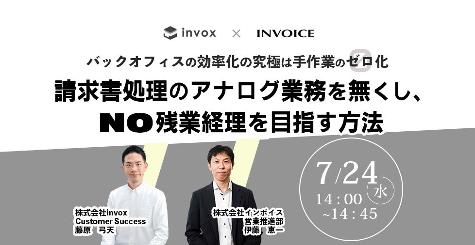 株式会社インボイス(代表取締役:加茂 正巳 本社:東京都千代田区)は、受取請求書の入力作業が自動化できる請求書受領システムを提供する、株式会社invox(代表取締役:横井 朗 本社:東京都新宿区)とバックオフィスの効率化に関する共催Zoomウェブセミナーを開催致しますのでお知らせいたします。