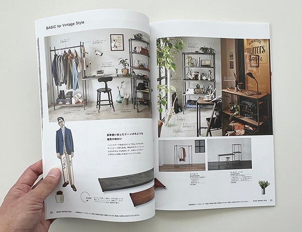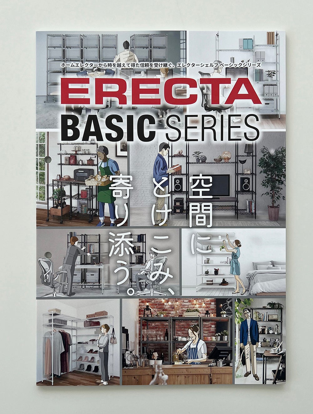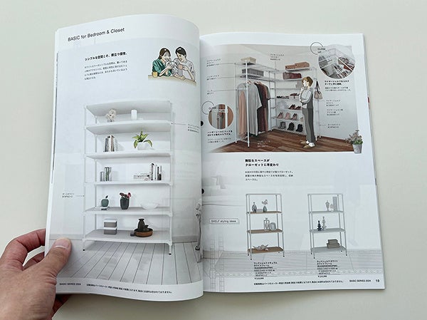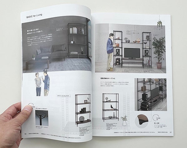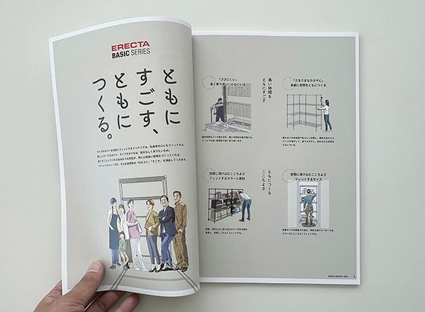 今回のカタログリニューアルでは「空間にとけこみ、寄り添う。」をテーマに、職場や家庭内の様々なシーンの使用イメージを訴求。登場人物にはカジュアルなイラストを採用し、親しみやすさを演出しています。「エレクターシェルフ ベーシックシリーズ」を共につくる心地よさ、長い時間を共に過ごす居心地の良さを表現しています。