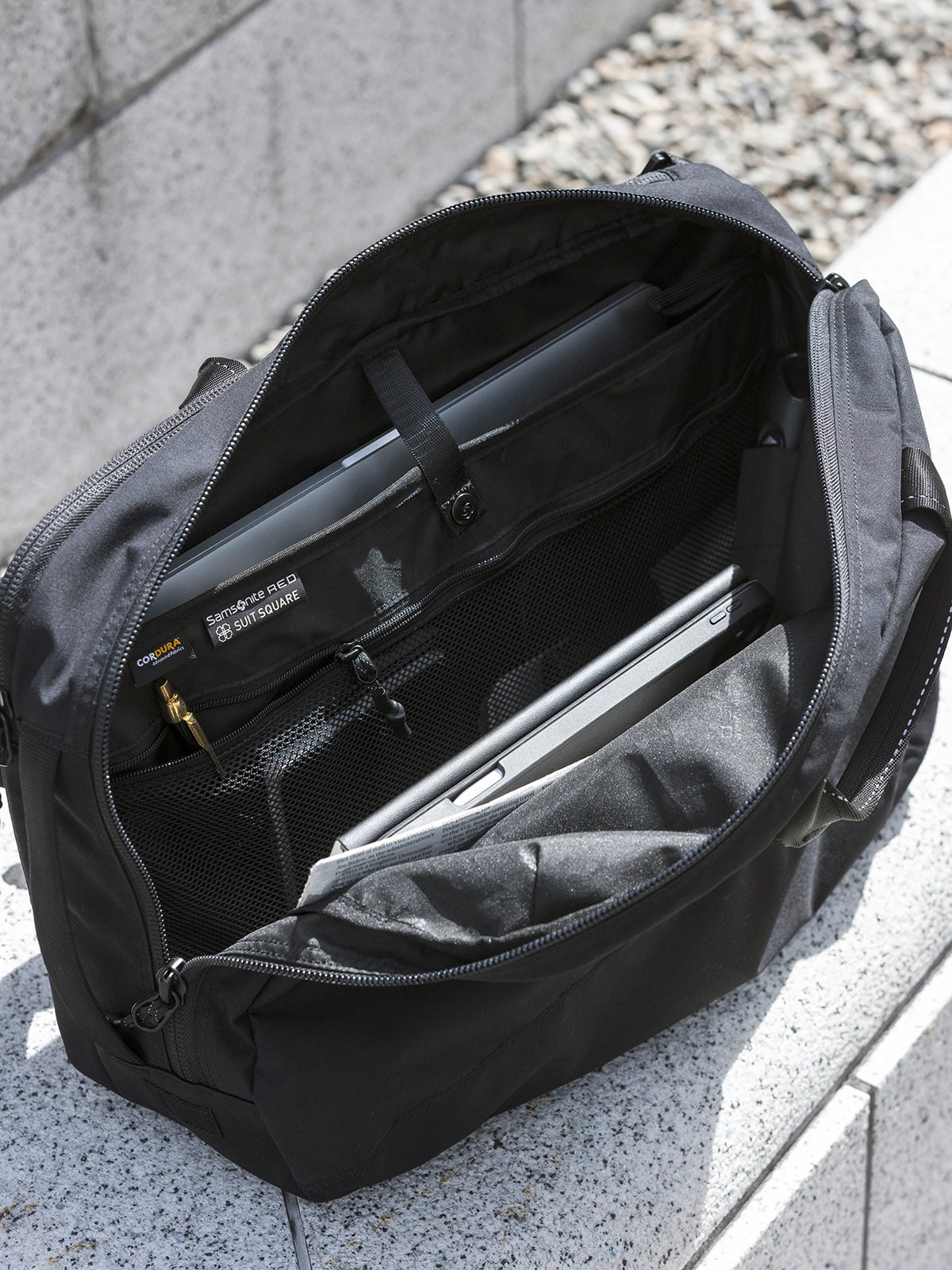 軽量コーデュラナイロンを採用したトート&ショルダーバッグの2WAY仕様で、メッセンジャーバッグのように斜め掛けにできます。一泊程度の出張や、旅行等オンオフ問わず活躍します。