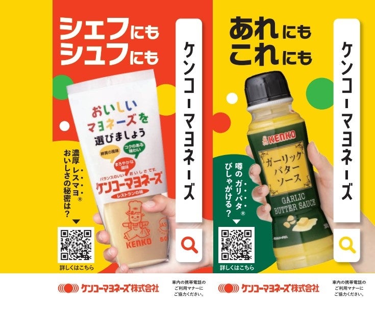 このたびつり革広告に掲載する商品には、当社の主力商品である『ケンコーマヨネーズ レストランの味』と『ガーリックバターソース』を選定。コーポレートカラーである「赤」と、親しみやすさのある「黄」を使った明るいデザインが目を引きます。当社が長年、業務用メーカーとして培ってきた商品の美味しさや品質へのこだわりを広く一般消費者にもお届けし、商品を手に取っていただきたいという想いを込めています。