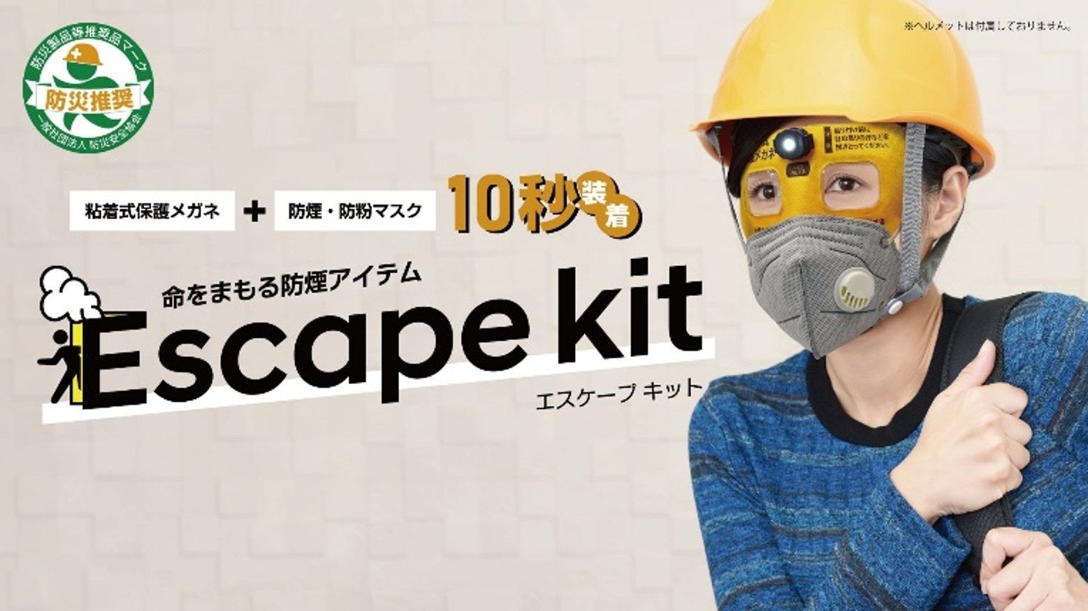 エスケープキットは、サッと素早く装着できる粘着式保護メガネと手軽でありながら高性能な防煙・防粉マスクが一つのパッケージに同梱されており、目と呼吸器を保護しながら、安全な避難をサポートします。