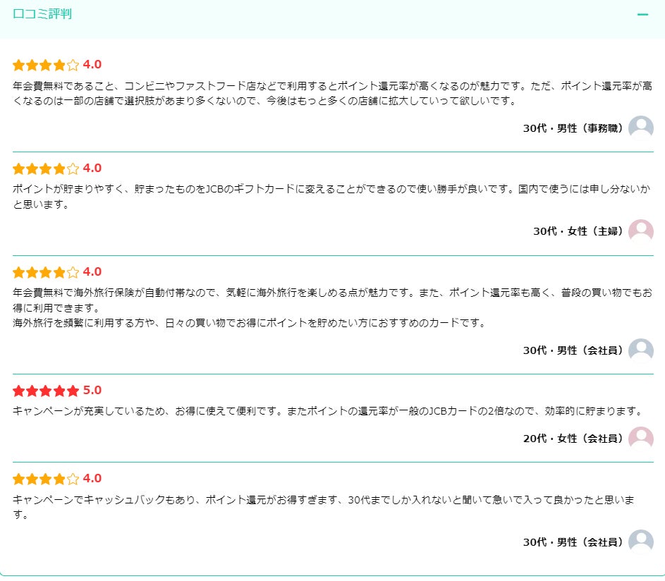 口コミ以外に利用者の総合評価、年代・性別・職業をいれることで、より商品について知ることができ自分に合う商品を比較しやすくなっております。