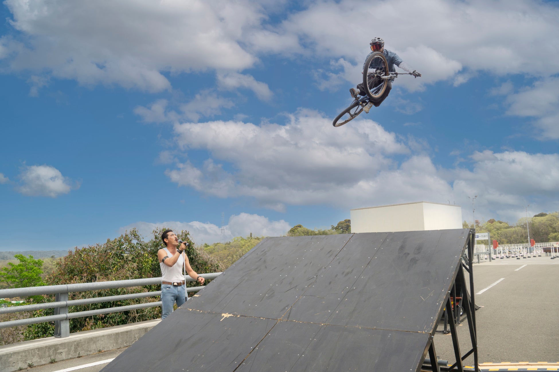 続いて、MTBライダーによるハイジャンプなどのパフォーマンスの後、マウンテンバイクに乗りながらテープカットを行い、会場を沸かせました。