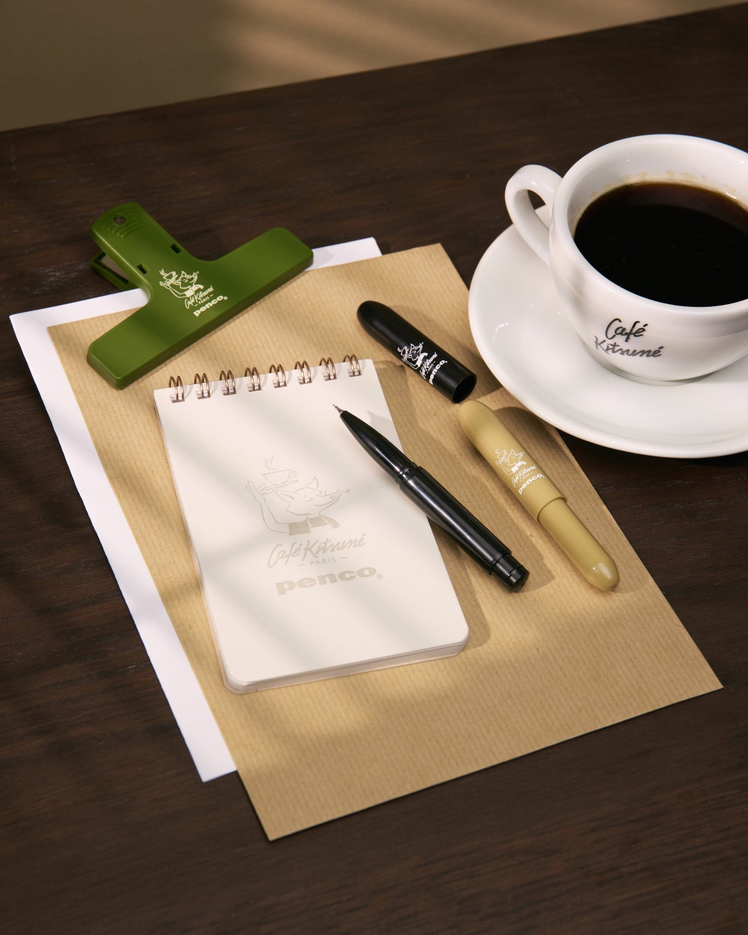 今回Café KitsunéとPenco®による初めてのコラボレーションとして、限定のステーショナリーカプセルを展開します。コーヒーカルチャーと日本のクラフトマンシップを融合させたオフィスエッセンシャルのセレクションには、スパイラルノート、ミニマルなクリップ、ボールペンや鉛筆など、細部までこだわったアイテムがラインナップされています。