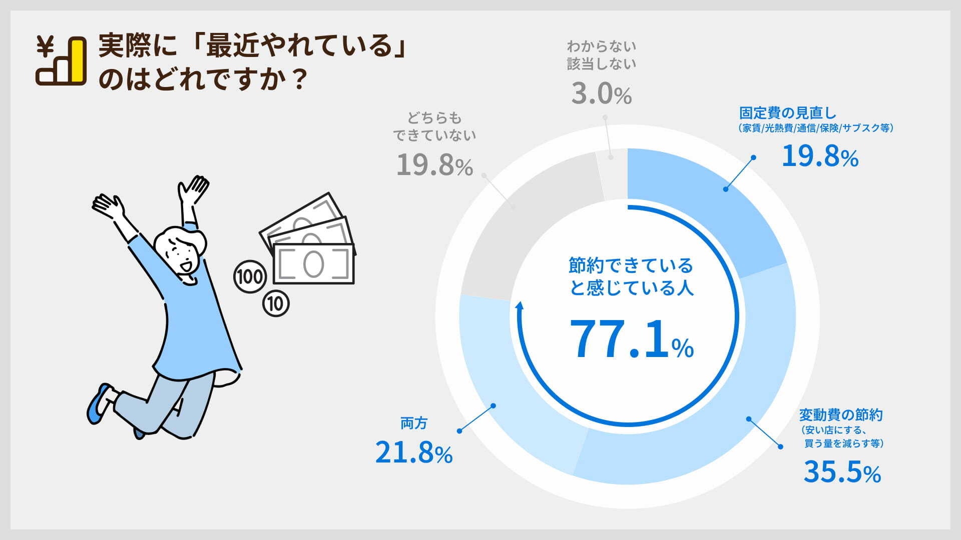 今回の調査では、節約の必要性を感じている人が80.2%にのぼり、さらに実際に対策を行った人は77.1%となりました。つまり、家計対策は単なる意識にとどまらず、すでに多くの生活者が具体的な行動に移していると考えられます。