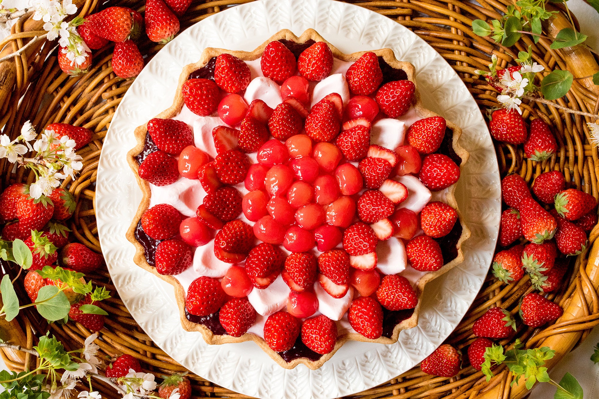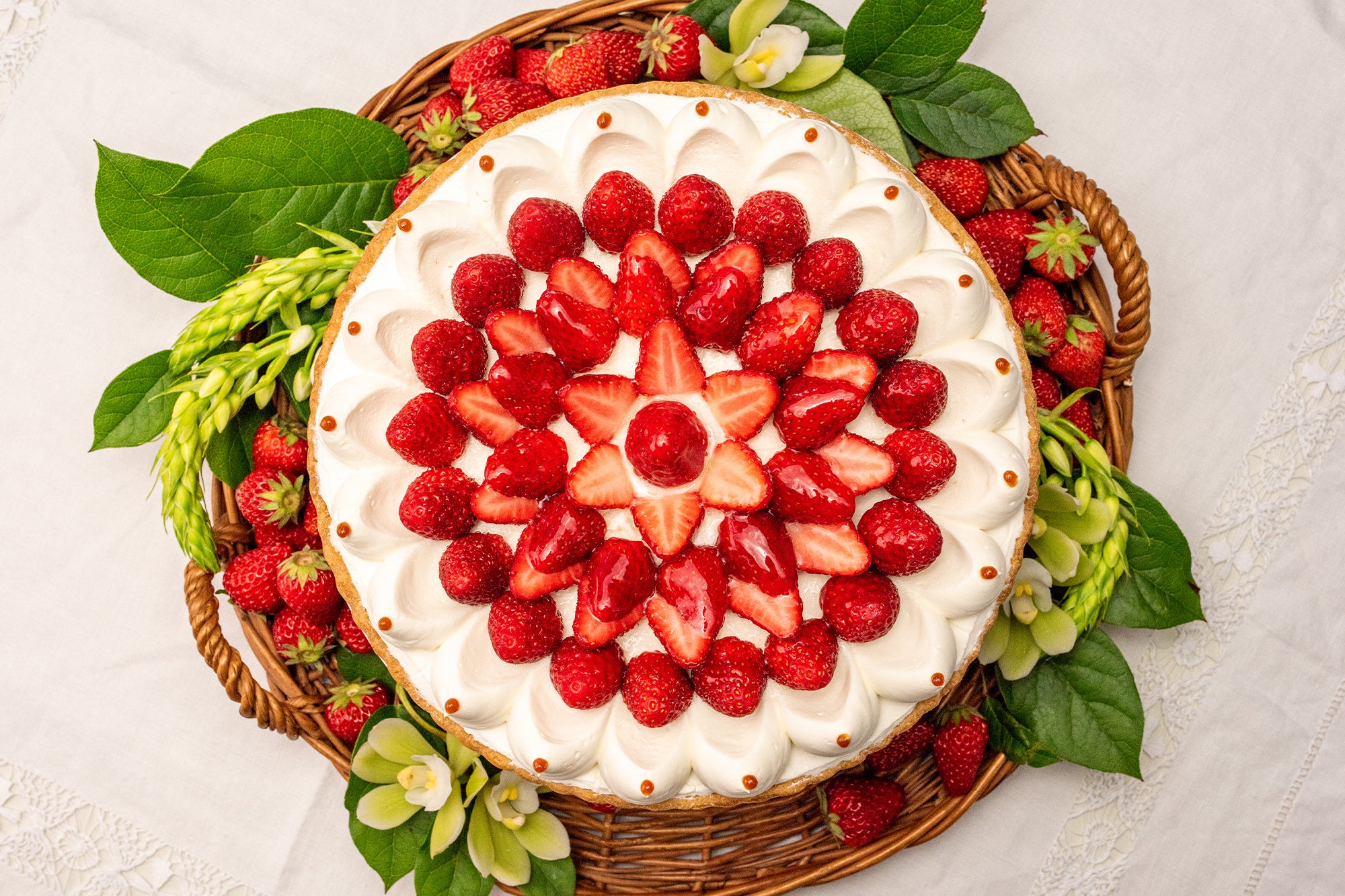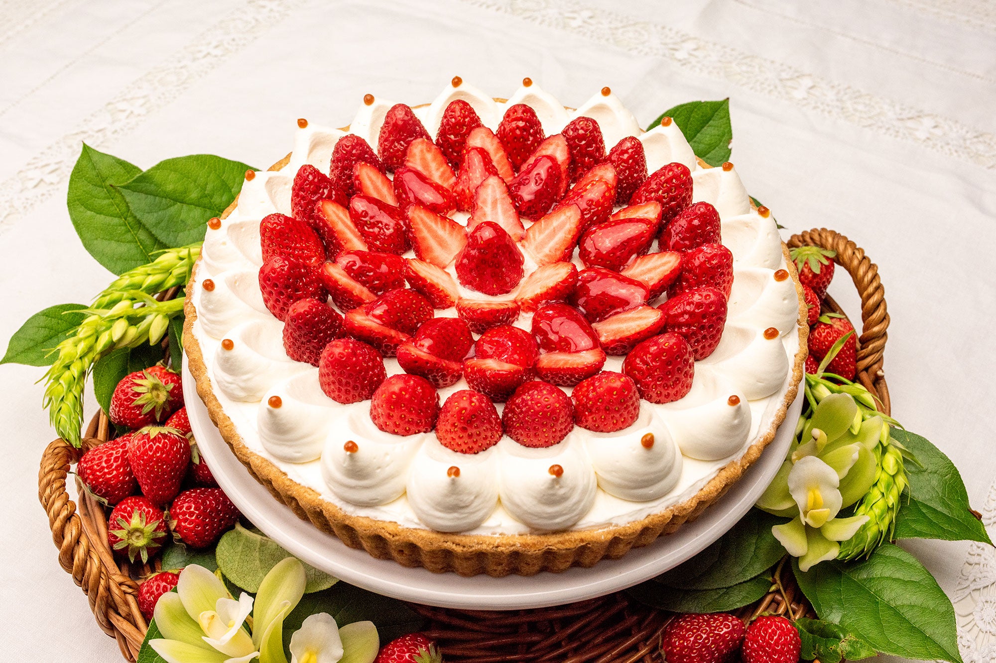 どこか懐かしい、プリンアラモードをイメージしたタルトです。カラメル風味のアーモンドクリームを焼き上げ、バニラ風味のカスタードプリンとクリームを重ね、イチゴを花のように飾りました。