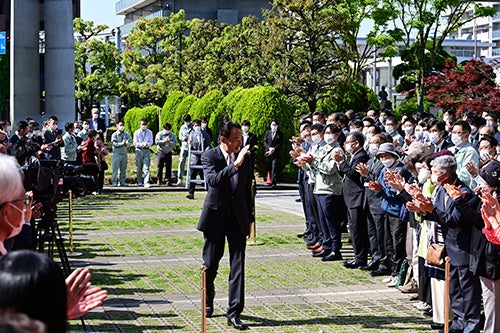 先月16日(日曜日)に告示された高槻市長選挙で当選を果たした濱田剛史第23代高槻市長が1日、職員や市民に拍手で出迎えられて初登庁しました。